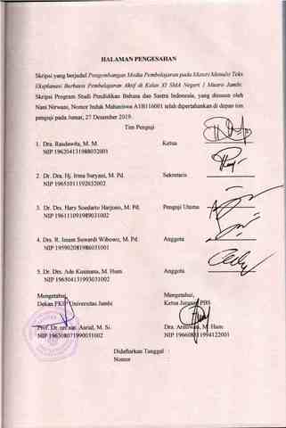 ABSTRAK Nirwani, Nani. 2019. Pengembangan Media Pembelajaran pada Materi Menulis Teks Eksplanasi Berbasis Pembelajaran Aktif di Kelas XI SMA Negeri 1 Muaro Jambi. Skripsi. Jambi: Program Studi Pendidikan Bahasa dan Sastra Indonesia, Jurusan Pendidikan Bahasa dan Seni, Fakultas Keguruan dan Ilmu Pendidikan, Universitas Jambi. Pembimbing: (1) Dra. Rasdawita, M.M., (II) Dr. Dra. Hj. Irma Suryani, M.Pd. Kata Kunci: pengembangan, teks eksplanasi, pembelajaran aktif Penelitian ini bertujuan untuk mengembangkan media pembelajaran pada materi menulis teks eksplanasi di kelas XI SMA berbasis pembelajaran aktif. Penelitian ini dilakukan di SMA Negeri 1 Muaro Jambi pada bulan Oktober 2019. Proses pengembangan media pembelajaran materi menulis teks eksplanasi ini melalui langkah-langkah pengembangan model ADDIE oleh Branch (2009) yaitu analisis (Analysis), desain (Design), pengembangan (Development), implementasi (Implementation), dan evaluasi (Evaluation). Pada tahap analisis (Analysis) dilakukan analisis kebutuhan, analisis karakteristik siswa, analiais tujuan, analisis materi, analisis sarana dan sumber belajar. Pada tahapan desain (Design), dilakukan tahap medisain media pembelajaran yang diharapkan oleh pengguna dan metode pengujian yang tepat. Pada tahap Pengembangan (Development) dilakukan telaah hasil analisis, validasi media serta instrumen, dan telaah literatur yang relevan, sehingga menghasilkan produk berupa media pembelajaran materi menulis teks eksplanasi berbasis pembelajaran aktif yang layak uji coba. Tahap berikutnya dilakukan implementasi (Implementation) media pembelajaran secara uji satu-satu dan uji lapangan dengan The One Group Pretest Posttest Design dan evaluasi (Evaluation), level evaluasi yang digunakan pada penelitian ini adalah level 1 yaitu presepsi (Preception) dan level 2 yaitu pembelajaran (Learning). Kepraktisan media pembelajaran materi menulis teks eksplanasi ini terdiri dari 3 aspek yakni kelayakan konten dengan rata-rata 88.04, kelayakan tampilan dengan rata-rata 85.49, dan teknik kebahasaan dengan rata-rata 93.75, dengan rata-rata ketiga aspek tersebut dengan nilai 89.09 tergolong praktis. Keefektifan dalam penelitian ini diukur dengan melihat selih nilai N-Gain Pretes dan Postes baik kemampuan kognitif maupun psikomotorik. Selisih pretes dan postes aspek kognitif sebesar 0,70 maka N-Gain yang dihasilkan tergolong sedang. Selanjutnya, pada aspek psikomotor selisih pretes dan postes didapatkan nilai 0,76 maka N-Gain yang dihasilkan termasuk kategori tinggi. i