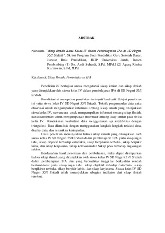 Nursilam. “Sikap Ilmiah Siswa Kelas IV dalam Pembelajaran IPA di SD Negeri 55/I Sridadi”. Skripsi Program Studi Pendidikan Guru Sekolah Dasar, Jurusan Ilmu Pendidikan, FKIP Universitas Jambi, Dosen Pembimbing (1) Drs. Andi Suhandi, S.Pd, M.Pd.I (2) Agung Rimba Kurniawan, S.Pd, M.Pd Kata kunci: Sikap Ilmiah, Pembelajaran IPA Penelitian ini bertujuan untuk mengetahui sikap ilmiah dan sikap ilmiah yang ditunjukkan oleh siswa kelas IV dalam pembelajaran IPA di SD Negeri 55/I Sridadi. Penelitian ini merupakan penelitian deskriptif kualitatif. Subjek penelitian ini yaitu siswa kelas IV SD Negeri 55/I Sridadi. Teknik pengumpulan data yaitu observasi untuk mengumpulkan informasi tentang sikap ilmiah yang ditunjukkan siswa kelas IV, wawancara untuk mengumpulkan informasi tentang sikap ilmiah, dan dokumentasi untuk mengumpulkan informasi tentang sikap ilmiah pada siswa kelas IV. Pemeriksaan keabsahan data menggunakan uji kredibilitas dengan triangulasi. Data dianalisis dengan menggunakan langkah-langkah reduksi data, display data, dan penarikan kesimpulan. Hasil penelitian menunjukkan bahwa sikap ilmiah yang ditunjukkan oleh siswa kelas IV SD Negeri 55/I Sridadi dalam pembelajaran IPA yaitu sikap ingin tahu, sikap objektif terhadap data/fakta, sikap berpikiran terbuka, sikap berpikir kritis, dan sikap kerjasama, Sikap ketekunan dan Sikap peka terhadap lingkungan sekitar. Berdasarkan hasil penelitian dan pembahasan, maka dapat disimpulkan bahwa sikap ilmiah yang ditunjukkan oleh siswa kelas IV SD Negeri 55/I Sridadi dalam pembelajaran IPA dari yang berkualitas tinggi ke berkualitas rendah berturut-turut yaitu sikap ingin tahu, sikap objektif terhadap data/fakta, sikap berpikiran terbuka, sikap berpikir kritis, dan sikap kerjasama. Siswa kelas IV SD Negeri 55/I Sridadi telah menunjukkan sebagian indikator dari sikap ilmiah tersebut.