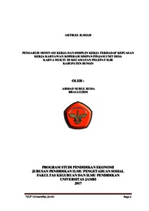 PENGARUH MOTIVASI KERJA DAN DISIPLIN KERJA TERHADAP KEPUASAN KERJA KARYAWAN KOPERASI SIMPAN PINJAM UNIT DESA KARYA MUKTI DI KECAMATAN PELEPAT ILIR KABUPATEN BUNGO Oleh: AHMAD NURUL HUDA (Fakultas Keguruan dan Ilmu Pendidikan Universitas Jambi) ABSTRAK Ahmad Nurul Huda. 2017. “Pengaruh Motivasi Kerja Dan Disiplin Kerja Terhadap Kepuasan Kerja Karyawan Koperasi Simpan Pinjam Unit Desa Karya Mukti Di Kecamatan Pelepat Ilir Kbupaten Bungo”. Skripsi. Program Studi Pendidikan Ekonomi. Jurusan PIPS FKIP Universitas Jambi. Pembimbing I Prof. Dr. Drs. Rahmat Murbojono, M.Pd, Pembimbing II Drs. Irwan, M.Pd Kata Kunci: Motivasi Kerja, Disiplin Kerja, Kepuasan Kerja Karyawan Berdasarkan hasil observasi dan beberapa data yang didapatkan, ditemukan adanya indikasi ketidak puasan kerja karyawan Koperasi. Gejala yang terlihat adalah ketidak puasan akan gaji, perilaku pemimpin, pekerjaan dan kondisi kerja, dll. Berdasarkan hasil wawancara dengan pegawai Koperasi Karya Mukti di Kecamatan Pelepat Ilir Kabupaten Muara Bungo. diketahui bahwa semenjak adanya kenaikan. Tujuan penelitian ini adalah untuk mengetahui pengaruh motivasi kerja dan disiplin kerja terhadap kepuasan kerja karyawan koperasi simpan pinjam Unit Desa Karya Mukti Dikecamatan Pelepat Ilir Kabupaten Bungo Jenis penelitian yang digunakan ini kuantitatif yaitu data yang dikumpulkan dan dinyatakan dalam bentuk angka-angka. Variabel bebas (independen variabel) yaitu motivasi kerja 〖(X〗_1) dan disiplin kerja 〖(X〗_2). Variabel terikat (dependen variabel). Hasil kepuasan kerja (Y). Berdasarkan hasil penelitian, dari uji hipotesis X1 terhadap Y variable motivasi kerja (X1) sebesar 0.320 atau dapat dinyatakan sebagai persamaan linier Y = 0.320 (X1). Pada tabel tersebut nilai t sebesar 10.412 dengan sig = 0,00, uji hipotesis X2 terhadap Y, analisis koefisien untuk disiplin kerja (X2) sebesar 0.517 atau dapat dinyatakan sebagai persamaan linier Y = 0.517(X2). Pada tabel tersebut nilai t sebesar 9.142 dengan sig = 0,00. Hasil uji hipotesis X1, X2 terhadap Y diketahui diketahui Rsquare = 0,437 sementara rtabel = 0,339 Sehingga, dapat disimpulkan bahwa Ho ditolak dan Ha diterima yaitu terdapat pengaruh yang signifikan antara motivasi kerja dan disiplin kerja terhadap kepuasan kerja dengan Besaran dalam Persamaan Regresi sebesar 43.7%. Sehingga dapat disimpulkan bahwa pengaruh motivasi kerja dan disiplin kerja terhadap kepuasan kerja karyawan koperasi simpan pinjam unit Desa Karya Mukti di Kecamatan Pelepat Ilir Kabupaten Bungo.