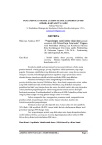 PENGEMBANGAN MODEL LATIHAN TEKNIK DASAR PEMAIN SSB GELORA KARYA KOTA JAMBI Ardimas Oktavian S1 Pendidikan Olahraga dan Kesehatan, Fakultas Ilmu Keolahragaan, UNJA Ardimaso95@gmail.com ABSTRAK Oktavian, Ardimas 2017 :”Pengembangan model latihan teknik dasar pemain sepakbola SSB Gelora Karya Kota Jambi”. Program studi Pendidikan Olahraga dan Kesehatan Fakultas Ilmu Keolahragaan Universitas jambi. Pembimbing (I) Endarman Saputra, S.Pd.,M.Sc., Pembimbing (II) Adhe Saputra,S.Pd.,M.Pd., Kata Kuci : Model teknik dasar passing, dribbling dan shooting Pemain Sepakbola SSB Gelora Karya Kota Jambi u10-14 Sepakbola adalah suatu permainan beregu yang terdiri dari sebelas orang pemain termasuk seorang penjaga gawang. Sepakbola adalah permainan yang sangat populer. Permainan sepakbola sering dilakukan oleh anak-anak, orang dewasa maupun orang tua. Saat ini perkembangan permainan sepakbola sangat pesat sekali, hal ini ditandai dengan banyaknya sekolah-sekolah sepakbola (SSB) yang didirikan. Penelitian ini bertujuan untuk mengembangkan model latihan passing,dribbling dan shooting SSB Gelora Karya Kota Jambi, supaya ada variasi latihan yang lebih efektif dan tidak membosankan. Penelitian yang dilakukan merupakan penelitian kualitatif yang berupa alasan dan saran, dan teknik analisi data yang digunakan dalam penelitian pengembangan ini adalah menggunakan teknik analisis deskriptif berbentuk persentase. Penelitian kualitatif ini dilakukan di SSB Gelora Karya Kota Jambi dengan jumlah sampel 18 orang pemain dengan umur 10-14 tahun. Dalam menganalisi data menggunakan prosentase untuk menganalisis dan penelian subjek pengembangan dalam menilai tingkat kelayakan, kualitas dan ketertrimaan produk pengembangan. Berdasarkan hasil uji coba diperoleh data evaluasi ahli yaitu ahli sepakbola 90% (Baik), Ahli sepakbola (II) 95% (sangat baik), dari uji coba lapangan didapat hasil persentase lapangan 95%(Sangat baik). Dari pengembangan produk yang dilakaukan maka dapat disimpulkan bahwa model latihan dribbling, passing dan shooting dapat digunakan dalam latihan di SSB Gelora Karya Kota Jambi dan latihan SSB lainya. Kata Kunci : Sepakbola, Model teknik dasar, SSB Gelora Kaya Kota Jambi