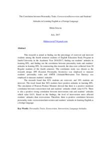 Abstract This research is aimed at finding out the percentage of extrovert and introvert students among the fourth semester students of English Education Study Program in Jambi University in the Academic Year 2016/2017, finding out students’ attitudes in learning EFL, and finding out the correlation between personality traits and students’ attitudes in learning EFL. In constructing this research, the data were collected from 50 Reguler students of the fourth semester. The correlation study was chosen as the research design. EPI (Eysenck Personality Inventory) was employed to measure students’ personality traits and AMTB (Attitude/Motivation Test Battery) was employed to measure students’ attitudes. The research found that 82% students are extrovert, and 18% students are introvert. The result found that 96% students have positive attitudes in learning EFL. The calculation of Pearson Product Moment showed that there is a positive moderate correlation between extraversion trait and students’ attitudes which value 0.574. There is also a positive strong correlation between introversion trait and students’ attitudes which value 0.631. Based on the findings, the level of introversion more affected students’ attitudes than extroversion. Therefore, there is positive correlation between personality traits: extraversion/introversion and students’ attitudes in learning English as a foreign language. Key Words: Personality Traits, Extraversion, Introversion, Language Attitudes