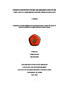 DEWANTI, MOLIGA (2017) STUDENTS’ PERCEPTION TOWARD THE IMPLEMENTATION OF THE TOEFL TEST AS A REQUIREMENT BEFORE THESIS EXAMINATION. D3 thesis, University of Jambi.