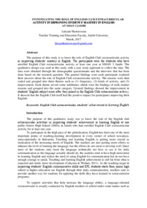 INVESTIGATING THE ROLE OF ENGLISH CLUB EXTRACURRICULAR ACTIVITY IN IMPROVING STUDENTS’ MASTERY IN ENGLISH AT SMAN 3 JAMBI Lidyani Harisiswana Teacher Training and Education Faculty, Jambi University March, 2017 lidyaniharisiswana@gmail.com Abstract The purpose of this study is to know the role of English Club extracurricular activity in improving students’ mastery in English. The participants were the students who have enrolled English Club extracurricular activity at least one year at SMAN 3 Jambi. The qualitative design was used in this study with a case study approach to collect the data. The data were obtained through the demographic questionnaire and the interview that has been done based on the research question. The general findings were each participant explored their answers about the role of English Club extracurricular activity. The reasons were then coded and grouped into three themes such as (1) frequency, (2) kinds of activity, and (3) improvement. Each theme served some subthemes which were the findings of each student reasons and grouped into the same category. General findings showed the improvement in students’ English subject score after they joined in the English Club extracurricular activity. It showed that the English Club itself had the positive impact for participants improving their English. Keywords: English Club extracurricular, students’ achievement in learning English