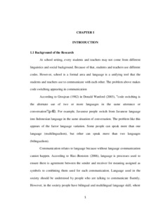 ABSTRACT Sahidayanti,Septi. Code Switching Used by Teachers in Teaching English at Senior High School 10 Jambi City. A thesis. English Study Program. Teacher Training and Education Faculty of Jambi University. The first Supervisor is Drs.Ahmad Ridha,MA. The Second is Dedy Kurniawan, S.S., M.A Keywords: Code, Code Switching The purpose of this research is to describe the types of code switching used by teachers while teach in the classroom and to describe the reasons why teachers used code switching in the process of teaching and learning in the classroom. The participants of this research were the second grade English teacher of SMA 10 Jambi City. The qualitative research with a describe study approach was used. The instruments used by the researcher to collect the data were observation sheets and interview protocol in order to describe the types of code switching and the reasons why teacher used code switching in the process of teaching and learning in the classroom. In this research, the researcher observed directly when the teacher undertook the process of teaching in the class and also interviewed them to complement the information about the types of code switching that the teacher used and the reasons why the teacher used code switching in the process of teaching and learning in the classroom. From this research, the researcher found that each of types code switching exist in the classroom, but Intersentential code switching and tag switching dominated used by the teacher in the classroom. The reasons for teachers using code switching in the classroom found the students easier to understand about the material that has been taught by the teacher. The objective of this study is to found the types of code switching that used by English teachers at SMAN 10 Jambi City and found the reasons why teacher use code switching in the process of teaching and learning. The types of code switching that teacher used in the process of teaching and learning are different and also the reasons why they used code switching in the process teaching and learning are different too. In this research, researcher focused on answer the question research, hence there were three major themes. The first theme was frequency of switching the language from English to Indonesia. Frequency itself means how often teachers in the class do code switching when giving explanations about the material presented by the teacher. Code switching itself would be useful for students who have little difficulty understand the meaning of English language spoken by teachers who teach them. This study shows that, it was important to did the code switching because the code switching would help children to understand the language, especially English which English wasn’t their mother tongue. In the observations and interviews to the participants also found that teachers do code switching when they explain a material related to English when the learning process is in progress. The teacher himself said that the code switching will help the child in understanding the material given and understand the English words themselves so that with good understanding by the students in class then the process of teaching and learning in class will be more fun. But in doing the code switching itself, the teacher provides limits, among others, teachers only do code switching on the important points that exist within the given material. Code switching that has been used by the teacher when doing explanation of the subjects given rare spelled out because the teacher think if it keeps doing code switching then the child will not be independent in understanding the English language itself. According to Seville-Troike (1986:69), Sometimes people want to communicate only to certain people or community they are belong to. To avoid the other community or people interfering their communication, they may try to exclude those people by using the language that not everybody knows. In this case shows that code switching very important to be done to overcome the mistake in communicating because someone didn’t understand what we are talking about The second is the function of code switching in the classroom. According to Alcnaurova (2013), code switching is communicative strategy in bilingual communities where the people are able to speak two languages and they choose a code to transmit their intentions in the best way. Code switching is a phenomenon of language contact that is generally define as the alternate use of two or more languages in conversation. According to Ishayanti (2009), code switching occurs when a bilingual speaker uses more than one language in a single utterance to appropriately convey their intents. Based on definition about code switching above, we knew that code switching important in communication. In the conversation itself each speaker must understand the language to be spoken to other in order to create a good communications between them. In this case the code switching will provide some functions, especially in the learning done by the teacher to the students in the class. First, explanation occurs usually when the teacher wants to repeat what has been previously said in another language in order to help the students understand the teachers who teach in the classroom. Second, code switching help the students in menanggulangi problem during the lesson. Third, code switching occurs when the teacher asks a pupil something in English they cannot understand and the other pupils will help translating the teacher’s question into finish. Code switching from English to Indonesia or vice versa as practiced by English teachers serve three functions that include presenting materials, managing classroom activities, and representing discourse markers. In addition, During the observation took place as well as interviews on the participants also showed the switching code performed by teachers to English subjects that occurred in the learning process is 