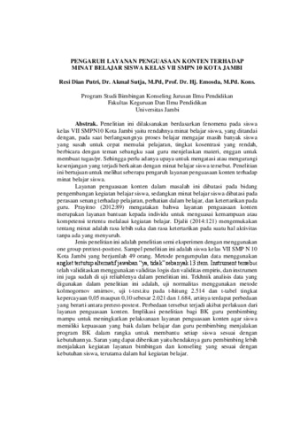 Dian Putri, Resi PENGARUH LAYANAN PENGUASAAN KONTEN TERHADAP MINAT BELAJAR SISWA KELAS VII SMPN 10 KOTA JAMBI. Jurnal Penelitian Universitas Jambi. ISSN 0852-8349