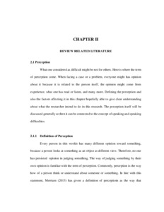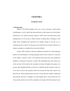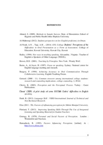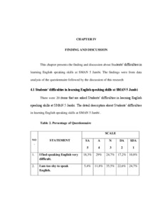 Tiara.Ardilla.Tama.2017. Students’ difficuties in learning English speaking skill at SMAN 5 Jambi. Thesis, Faculty of Teacher Training and Education, Jambi University. First supervisor: Reny Heryanti, S.S, M.Hum and second supervisor: Susanah, S.Pd, M.Sc Key words: Perception, Speaking skill, Difficulties This research Students’ difficulties in learning English speaking skill at SMAN 5 Jambi. The objective of the study is to find out students’ difficulties in learning English speaking skill. The design of the research is by using quantitative method with survey research design. The subject of this research is the Students’ (Science class) at SMAN 5 Jambi. The data of this research were collected by using questionnaire. The item for the questionnaire were adapted from Khampreted(2012) it has 20 closed statements, the questionnaire were distributed to 93 respondents, the result showed that students have problem with their confidence, the students afraid of making mistakes while speaking English. They also felt nervous and worried when speaking English. In aspect of pronunciation and vocabulary, they have difficulties in completing the sentences. They confess that they want to speak like native. Unfortunately, they do not have good pronunciation they also have problem in grammar. This research suggested that the students should solve their own problem in learning English, they may read English books and articles to overcome their vocabulary problems. They may also practice with their friend to practice their pronunciation and speaking skills, the most important point is that the students have to be confidence to speak English.