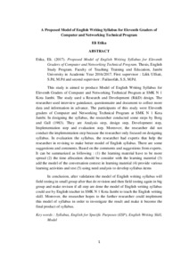 ABSTRACT Etika, Eli. (2017). Proposed Model of English Writing Syllabus for Eleventh Graders of Computer and Networking Technical Program. Thesis, English Study Program. Faculty of Teaching Training and Education, Jambi University in Academic Year 2016/2017. First supervisor : Lilik Ulfiati, S.Pd, M.Pd and second supervisor : Failasofah, S.S, M.Pd. Key words : Syllabus, English for Specific Purposes (ESP), English Writing Skill, Model This study is aimed to produce Model of English Writing Syllabus for Eleventh Graders of Computer and Networking Technical Program at SMK N 1 Kota Jambi. The study used a Research and Development (R&D) design. The researcher used interview guindance, questionnaire and document to collect more data and information in advance. The participants of this study were Eleventh graders of Computer and Networking Technical Program at SMK N 1 Kota Jambi. In designing the syllabus, the researcher conducted some steps by Borg and Gall (1983). They are Analysis step, design step, Development step, Implementation step and evaluation step. Moreover, the researcher did not conduct the implementation step because the researcher only focused on designing syllabus. In evaluation the syllabus, the researcher had experts that help the researcher in revising to make better model of English syllabus. There are some suggestions and comments. Based on the comments and suggestions from experts. It can be summarized as following : (1) the learning material have to be more spread (2) the time allocation should be consider with the learning material (3) add the model of the conversation context in learning material (4) provide various learning activities and test (5) using need analysis to develop syllabus items In conclusion, after validation the model of English writing syllabus will field testing in small group after that do revision and then field testing again in big group and make revison if all step are done the model of English writing syllabus could use by English teacher in SMK N 1 Kota Jambi to teach the English writing skill. Moreover, the researcher hopes to the further researcher could implement this model of syllabus in order to investigate the result and make it become the final product of syllabus.