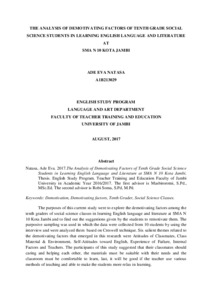 Natasa, Ade Eva. 2017.The Analysis of Demotivating Factors of Tenth Grade Social Science Students in Learning English Language and Literature at SMA N 10 Kota Jambi. Thesis. English Study Program. Teacher Training and Education Faculty of Jambi University in Academic Year 2016/2017. The first advisor is Masbirorotni, S.Pd., MSc.Ed. The second advisor is Robi Soma, S.Pd, M.Pd. Keywords: Demotivation, Demotivating factors, Tenth Grader, Social Science Classes. The purposes of this current study were to explore the demotivating factors among the tenth graders of social science classes in learning English language and literature at SMA N 10 Kota Jambi and to find out the suggestions given by the students to remotivate them. The purposive sampling was used in which the data were collected from 10 students by using the interview and were analyzed them based on Creswell technique. Six salient themes related to the demotivating factors that emerged in this research were Attitudes of Classmates, Class Material & Environment, Self-Attitudes toward English, Experience of Failure, Internal Factors and Teachers. The participants of this study suggested that their classmates should caring and helping each other, the materials must be suitable with their needs and the classroom must be comfortable to learn, last, it will be good if the teacher use various methods of teaching and able to make the students more relax in learning.