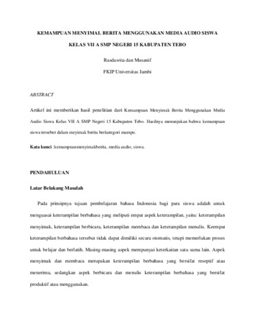 KEMAMPUAN MENYIMAK BERITA MENGGUNAKAN MEDIA AUDIO SISWA KELAS VII A SMP NEGERI 15 KABUPATEN TEBO Rasdawita dan Musanif FKIP Universitas Jambi ABSTRACT Artikel ini memberikan hasil penelitian dari Kemampuan Menyimak Berita Menggunakan Media Audio Siswa Kelas VII A SMP Negeri 15 Kabupaten Tebo. Hasilnya menunjukan bahwa kemampuan siswa tersebut dalam meyimak berita berkategori mampu. Kata kunci :kemampuanmenyimakberita, media audio, siswa.