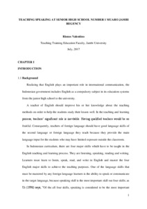 Valentino, Riones (2017). TEACHING SPEAKING AT SENIOR HIGH SCHOOL NUMBER 1 MUARO JAMBI REGENCY. A Thesis. English Education Program. Teacher Training and Education Faculty of Jambi University. The first supervisor is Eddy Haryanto, S, Pd., Msc.Ed., MPP. The second supervisor is Akhmad Habibi, S.Pd.I.,M.Pd. Key words: Teaching Speaking, Teaching Speaking Activities, Teaching Speaking Evaluations This research aimed at investigating activities in implementing teaching speaking in teaching English that faced by English teachers and found out their evaluations of those activities. This research used interview to collect the data from two English teachers of one public senior high school in Muaro Jambi. The result showed that the English teachers had six activities in implementing teaching speaking. The activities namely, Acting from script , Picture describing, Discussion, Communication games, Prepared talks, and Short conversation. Then, there were five evaluations that applied by English teachers to evaluate the activities, they were oral interview, Role play and simulations, Imitation, Oral presentation, and Personal interview. Therefore, this research could be helpful for another English teacher to comprehend and implement Teaching Speaking.