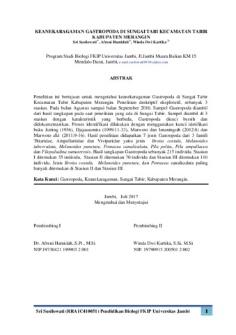 SUSILOWATI, SRI KEANEKARAGAMAN GASTROPODA DI SUNGAI TABI KECAMATAN TABIR KABUPATEN MERANGIN. KEANEKARAGAMAN GASTROPODA DI SUNGAI TABI KECAMATAN TABIR KABUPATEN MERANGIN. (Submitted)