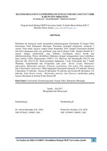 ABSTRACT This study aims to determine the diversity of Gastropoda in the Tabir River District Tabir Merangin District. Descriptive explorative research, as many as 3 stations. In August to September 2016. Gastropoda samples were taken from the catch at the time of the research on the Tabir River. Samples were taken at 3 stations with different characteristics, Gastropoda was washed and documented. The identification process is done by using Jetting book idetification key (1956), Djajasasmita (1999: 11-33), Marwoto and Isnaningsih (2012: 8) and Marwoto et al (2011: 9-16). The results of the research were 7 types of Gastropods from 3 families of Thiaridae, Ampullariidae and Viviparidae, namely Brotia costula, Melanoides tuberculata, Melanoides punctate, Pomacea canaliculata, Pila polita, Pila ampullacea and Filopaludina sumatrensis. Gastropoda catches were 215 individuals. Station I found 35 individuals, Station II found 70 individuals and Station III found 110 individuals. Type Brotia costula, Melanoides punctate, and Pomacea canaliculata most commonly found in Station II and Station III. Keywords: Gastropoda, Diversity, Tabir River, Merangin District.