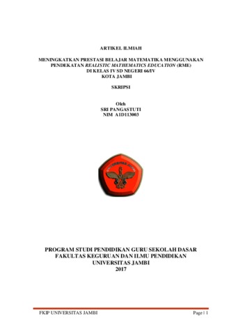 ABSTRAK Pangastuti, Sri. 2017 “Meningkatkan Prestasi Belajar Matematika Menggunakan Pendekatan Realistic Mathematics Education (RME) di Kelas IV SD Negeri 66/IV Kota Jambi”. Skripsi Program Studi Pendidikan Guru Sekolah Dasar, Jurusan Ilmu Pendidikan, FKIP Universitas Jambi. Pembimbing (1) Dr. Yantoro, M.Pd dan Pembimbing (2) Suci Hayati, S.Pd, M.Pd Kata kunci: Pendekatan realistic mathematics education, prestasi belajar matematika. Berdasarkan hasil observasi yang dilakukan di kelas IV SD Negeri 66/IV Kota Jambi, siswa memiliki antusias yang baik ketika pembahasan mata pelajaran matematika disampaikan oleh guru. Pemberian variasi soal telah dilakukan oleh guru terutama dalam bentuk soal hitung berupa angka, namun ketika bentuk soal yang diberikan berbentuk soal cerita atau soal yang meminta siswa untuk mengembangkan logikanya, siswa mengalami kesulitan dalam penyelesaiannya. Penelitian ini bertujuan untuk mengetahui penggunaan pendekatan RME dalam meningkatkan prestasi belajar matematika. Jenis penelitian yang digunakan adalah penelitian tindakan kelas yang dilakukan secara kolaboratif bersama guru kelas. Penelitian dilaksanakan pada tahun ajaran 2016/2017. Desain penelitian ini menggunakan modifikasi model Kemmis & McTaggart dalam 2 siklus yang terdiri dari perencanaan, pelaksanaan, pengamatan, dan refleksi. Subjek penelitian siswa kelas IV Sekolah Dasar Negeri 66/IV Kota Jambi. Objek penelitian adalah prestasi belajar matematika siswa. Teknik pengumpulan data menggunakan observasi dan data penelitian dianalisis dengan teknik deskriptif kuantitatif untuk menganalisis hasil tes dan lembar pengamatan. Hasil penelitian menunjukkan bahwa penerapan pendekatan RME dapat meningkatkan prestasi belajar siswa kelas IV SDN 66/IV Kota Jambi. Hal ini ditunjukkan melalui peningkatan prestasi siswa berdasarkan kriteria ketuntasan yang telah ditetapkan pada lembar observasi. Pada siklus I pertemuan 1 didapatkan hasil skor lembar observasi rata-rata 49,9% dan pertemuan 2 rata-rata 56% dimana angkat tersebut masih rendah karena penelitian dikatakan berhasil apabila siswa mencapai 80%. Sedangkan pada siklus II pertemuan 1 siswa mendapatkan rata-rata 67% dan pertemuan 2 rata-rata siswa memperoleh nilai 84,8%. Berdasarkan hasil yang diperoleh siswa, dapat disimpulkan bahwa selama proses pembelajaran menggunakan pendekatan RME prestasi siswa meningkat dan memenuhi kriteria ketuntasan 80% dengan hasil akhir penelitian 84,8%. Dengan hasil penelitian tersebut dapat disimpulkan bahwa RME memiliki peran dalam meningkatkan prestasi belajar siswa di kelas IV SD Negeri 66/IV Kota Jambi.