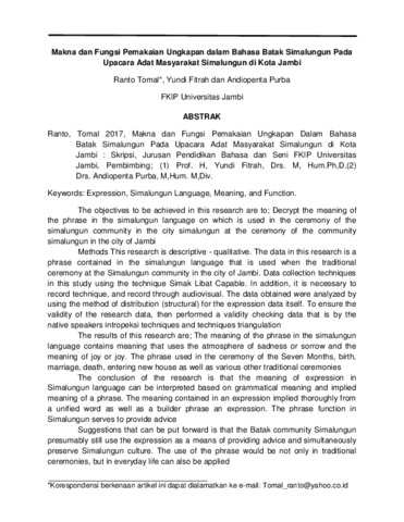 ABSTRAK Ranto, Tomal 2017, Makna dan Fungsi Pemakaian Ungkapan Dalam Bahasa Batak Simalungun Pada Upacara Adat Masyarakat Simalungun di Kota Jambi : Skripsi, Jurusan Pendidikan Bahasa dan Seni FKIP Universitas Jambi, Pembimbing; (1) Prof. H, Yundi Fitrah, Drs. M, Hum.Ph,D.(2) Drs. Andiopenta Purba, M,Hum. M,Div. Keywords: Expression, Simalungun Language, Meaning, and Function. The objectives to be achieved in this research are to; Decrypt the meaning of the phrase in the simalungun language on which is used in the ceremony of the simalungun community in the city simalungun at the ceremony of the community simalungun in the city of Jambi Methods This research is descriptive - qualitative. The data in this research is a phrase contained in the simalungun language that is used when the traditional ceremony at the Simalungun community in the city of Jambi. Data collection techniques in this study using the technique Simak Libat Capable. In addition, it is necessary to record technique, and record through audiovisual. The data obtained were analyzed by using the method of distribution (structural) for the expression data itself. To ensure the validity of the research data, then performed a validity checking data that is by the native speakers intropeksi techniques and techniques triangulation The results of this research are; The meaning of the phrase in the simalungun language contains meaning that uses the atmosphere of sadness or sorrow and the meaning of joy or joy. The phrase used in the ceremony of the Seven Months, birth, marriage, death, entering new house as well as various other traditional ceremonies The conclusion of the research is that the meaning of expression in Simalungun language can be interpreted based on grammatical meaning and implied meaning of a phrase. The meaning contained in an expression implied thoroughly from a unified word as well as a builder phrase an expression. The phrase function in Simalungun serves to provide advice Suggestions that can be put forward is that the Batak community Simalungun presumably still use the expression as a means of providing advice and simultaneously preserve Simalungun culture. The use of the phrase would be not only in traditional ceremonies, but in everyday life can also be applied
