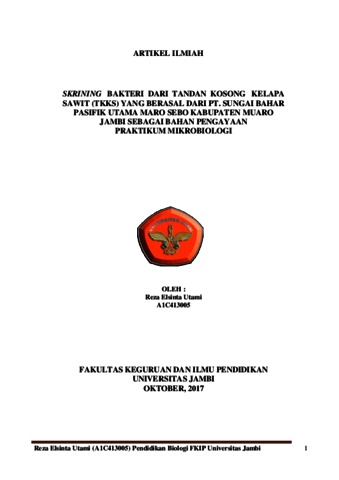 ABSTRAK Utami, Reza Elsinta 2017. Skrining Bakteri dari Tandan Kosong Kelapa Sawit (TKKS) yang berasal dari PT. Sungai Bahar Pasifik Utama Maro Sebo Kabupataen Muaro Jambi sebagai Bahan Pengayaan Praktikum Mikrobiologi: Skripsi, Jurusan Pendidikan Matematika dan Ilmu Pengetahuan Alam, FKIP Universitas Jambi, Pembimbing: (I), Retni S. Budiarti, S.Pd., M.Si (II), Dra.Hj. Harlis, M.Si. Kata kunci: Skrining, Bakteri, Limbah Tandan Kosong Kelapa Sawit (TKKS). Tandan kosong kelapa sawit (TKKS) merupakan limbah terbesar yang dihasilkan oleh perkebunan kelapa sawit. Produksi limbah TKKS semakin meningkat dengan meningkatnya produksi kelapa sawit setiap hari. Berbagai upaya yang dilakukan untuk mengelola limbah TKKS, salah satunya dijadikan sebagai bahan baku pembuatan pupuk organik. Penambahan isolat bakteri pada TKKS diharapkan dapat mempercepat waktu pengomposan. Salah satu cara yang dilakukan adalah dengan melakukan isolasi bakteri pada TKKS. Tujuan penelitian untuk mengetahui jenis bakteri yang terdapat pada TKKS yang berasal dari PT. Sungai Bahar Pasifik Utama Muaro Sebo Kabupaten Muaro Jambi. Jenis penelitian yang digunakan adalah deskriptif eksploratif dengan cara pengisolasian bakteri pada limbah TKKS. Penelitian dilakukan dengan beberapa tahapan, yakni pengambilan sampel bakteri, adaptasi pertumbuhan bakteri, isolasi bakteri, pemurnian bakteri, dan identifikasi bakteri yang mengacu pada buku Bergey Manual Of Determinative Bacteriology. Parameter pengamatan penelitian adalah pengamatan morfologi, pewarnaan gram, pewarnaan spora, dan uji biokimia. Hasil penelitian ini didapat 23 isolat bakteri dan diperoleh 12 genus diantaranya isolat S1, S3, S8 merupakan bakteri dari genus Clostridium, S2, S18, S22 Cytophaga, S4 Streptomyces, S5, S16 Actinomyces, S6 Klebsiella, S7, S9, S10 Cellulomonas, S11 dan S15 Staphylococcus, S12 genus Agrobacterium, S13, S20, S21 Bacillus, S14 Flavobacterium, S17, S19 Brucella, dan S23 Micromonospora. Berdasarkan hasil penelitian dapat disimpulkan bahwa 23 isolat bakteri inilah yang berpotensi melakukan penguraian terhadap TKKS. Disarankan kepada peneliti selanjutnya untuk dapat melakukan peramajaan yang berkesinambungan terhadap isolat bakteri yang telah didapat pada penelitian ini diharapkan agar dapat menjadi stok kultur yang bisa digunakan dalam pengendalian dan pengelolaan limbah TKKS di pabrik pengolahan kelapa sawit dan uji efektivitas 23 isolat potensial yang diperkirakan efektif sebagai dekomposer baik secara in vitro maupun skala lapangan.