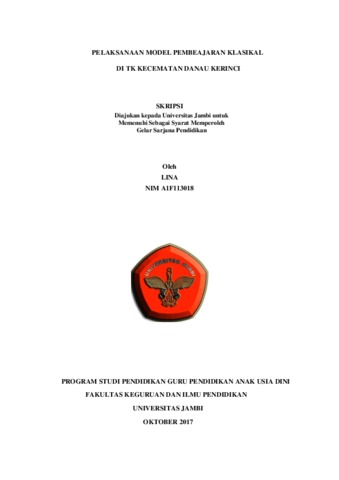 ABSTRAK Lina. A1F113018. 2017. “Pelaksanaan Model Pembelajaran Klasikal Di TK Kecematan Danau Kerinci”. Skripsi. Program Studi Pendidikan Guru Pendidikan Anak Usia Dini, Jurusan Ilmu Pendidikan, FKIP Universitas Jambi, Pembimbing (I) Dr. Drs H. Hendra Sofyan, M.Si (2) Nyimas Mu’azzomi, S.Ag,. M.Pd.I Kata Kunci: Pelaksanaan Model Pembelajaran Klasikal Pelaksanaan model pembelajaran klasikal yang diterapkan pada lembaga PAUD belum seutuhnya mengacu menu pembelajaran kurikulum 2013. Kemudian dimana tenaga mengajar PAUD masih minim, ada dari lulusan SMP dan SMA sederajat atau pun sarjana yang bukan lulusan PAUD sehingga dalam praktiknya tidak berjalan dengan optimal. Penelitian ini bertujuan untuk mendeskripsikan pelaksanaan model pembelajaran klasikal di TK kecematan danau kerinci. Metode dalam penelitian ini adalah deskriptif kuantitatif dan kualitatif dengan informan penelitian yaitu TK yang berada di Kecematan Danau Kerinci, teknik pengumpulan data dilakukan dengan 3 cara; Angket, Observasi, dan Wawancara. Analisis data angket dan observasi menggunakan teknisk statistik dan wawancara menggunakan analisis interaktif. Hasil penelitian dari angket menunjukkan bahwa pelaksanaan model pembelajaran klasikal berada pada kualitas “Baik” dengan hasil persentase 81% . pada indikator settingan kelas hasil persentase 75%, pada indikator persiapan mengajar hasil persentase 77%, pada indikator proses pelaksanaan hasil persentase 93%. Sedang kan dari hasil Observasi menunjukkan bahwa pelaksanaan model pembelajaran klasikal berada pada kualitas “baik” dengan hasil persentase 83%. Pada indikator settingan kelas hasil persentase 64%, pada indikator persiapan mengajar hasil persentase 32%, pada indikator proses pelaksanaan hasil persentase 70 %. Hasil dari wawancara bahwa sekolah sudah menerapkan model pembelajaran klasikal dengan baik. Settingan kelas terlihat bahwa sebagian besar sudah memadai untuk pembelajaran dikelas. Persiapan mengajar terlihat bahwa belum menggunakan kurikulum terbaru (K13), standar kurikulum, program tahunan dan semester,RPPM dan RPPH. Proses pelaksanaan terlihat bahwa guru sudah melaksanakan langkah-langkah kegiatan awal, kegiatan inti, istirahat dan kegiatan penutup. Berdasarkan hasil penelitian dapat disimpulkan bahwa pelaksanaan model pembelajaran klasikal di TK kecematan danau kerinci dapat kita lihat dari hasil Angket dan Observasi yang berada pada kualitas “Baik”. Dan juga diperkuatkan dengan hasil wawancara. Diharapkan dapat meningkatkan kualitas pembelajaran klasikal di TK yang berada di kecamatan danau kerinci sehingga lebih baik untuk kedepannya agar dapat mengoptimalkan seluruh perkembangan anak.