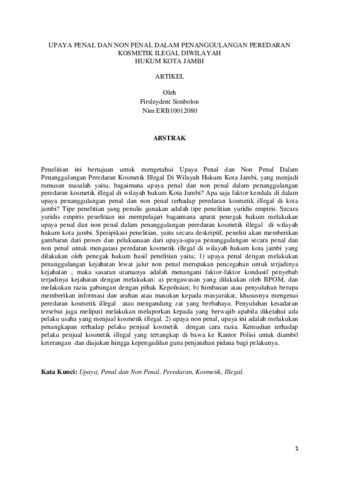 UPAYA PENAL DAN NON PENAL DALAM PENANGGULANGAN PEREDARAN KOSMETIK ILEGAL DIWILAYAH HUKUM KOTA JAMBI ARTIKEL Oleh Firsleydent Simbolon Nim ERB10012080 ABSTRAK Penelitian ini bertujuan untuk mengetahui Upaya Penal dan Non Penal Dalam Penanggulangan Peredaran Kosmetik Illegal Di Wilayah Hukum Kota Jambi, yang menjadi rumusan masalah yaitu, bagaimana upaya penal dan non penal dalam penanggulangan peredaran kosmetik illegal di wilayah hukum Kota Jambi? Apa saja faktor kendala di dalam upaya penanggulangan penal dan non penal terhadap peredaran kosmetik illegal di kota jambi? Tipe penelitian yang penulis gunakan adalah tipe penelitian yuridis empiris. Secara yuridis empiris penelitian ini mempelajari bagaimana aparat penegak hukum melakukan upaya penal dan non penal dalam penanggulangan peredaran kosmetik illegal di wilayah hukum kota jambi. Spesipikasi penelitian, yaitu secara deskriptif, peneliti akan memberikan gambaran dari proses dan pelaksanaan dari upaya-upaya penanggulangan secara penal dan non penal untuk mengatasi peredaran kosmetik illegal di wilayah hukum kota jambi yang dilakukan oleh penegak hukum hasil penelitian yaitu; 1) upaya penal dengan melakukan penanggulangan kejahatan lewat jalur non penal merupakan pencegahan untuk terjadinya kejahatan , maka sasaran utamanya adalah menangani faktor-faktor kondusif penyebab terjadinya kejahatan dengan melakukan: a) pengawasan yang dilakukan oleh BPOM, dan melakukan razia gabungan dengan pihak Kepolisian; b) himbauan atau penyuluhan berupa memberikan informasi dan arahan atau masukan kepada masyarakat, khususnya mengenai peredaran kosmetik illegal atau mengandung zat yang berbahaya. Penyuluhan kesadaran tersebut juga meliputi melakukan melaporkan kepada yang berwajib apabila diketahui ada pelaku usaha yang menjual kosmetik illegal. 2) upaya non penal, upaya ini adalah melakukan penangkapan terhadap pelaku penjual kosmetik dengan cara razia. Kemudian terhadap pelaku penjual kosmetik illegal yang tertangkap di bawa ke Kantor Polisi untuk diambil keterangan dan diajukan hingga kepengadilan guna penjatuhan pidana bagi pelakunya. Kata Kunci: Upaya, Penal dan Non Penal, Peredaran, Kosmetik, Illegal.