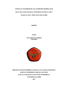 ABSTRAK Zahidin, Adi Akhmad. 2017. Tindak Tutur Direktif dalam Kegiatan Pembelajaran Mata Pelajaran Bahasa Indonesia di Kelas VIII C SMPNegeri 26 Muaro Jambi. Skripsi Program Studi Pendidikan Bahasa dan Sastra Indonesia. Jurusan Pendidikan Bahasa dan Seni, FKIP Universitas Jambi, Pembimbing 1 Prof. Dr. Mujiyono Wiryotinoyo, M. Pd, Pembimbing 2 Drs. Imam Suwardi, M. Pd. Kata-kata kunci: pragmatik, tindak tutur, tindak tutur direktif, Penelitian ini dilaksanakan dengan tujuan untuk mendeskripsikan jenis tindak tutur direktif yang ada dalam dalam kegiatan pembelajaran mata pelajaran Bahasa Indonesia di kelas VIII C SMPN 26 Muaro Jambi. Metode penelitian yang digunakan adalah deskriptif-kualitatif. Data penelitian ini adalah tuturan yang di dalamnya terdapat tindak tutur direktif dalam kegiatan pembelajaran mata pelajaran Bahasa Indonesia dan sumber data dalam penelitian ini guru mata pelajaran Bahasa Indonesia dan siswa kelas VIII C SMP Negeri 26 Muaro Jambi. Teknik yang digunakan dalam penelitian ini adalah teknik simak dan catat. Teknik simak ditentukan dengan cara mendengarkan dengan teliti, sedangkan teknik catat dilakukan dengan cara membuat catatan-catatan sesuai dengan apa yang dituturkan dalam kegiatan pembelajaran mata pelajaran Bahasa Indonesia di kelas VIIIC SMP Negeri 26 Muaro Jambi. Analisis data yang digunakan dalam penelitian ini adalah analisis pragmatik dengan teknik heuristik. peneliti bertindak sebagai human instrument yang berfungsi untuk menetapkan fungsi ciri penelitian, memilih objek sumber data, menafsirkan data dan membuat kesimpulan atas hasil temuannya. Pengecekan keabsahan data dilakukan dengan menggunakan teknik triangulasi peneliti. Triangulasi peneliti dilakukan dengan meminta bantuan ahli pragmatik yaitu Prof. Dr. Mujiyono Wiryotinoyo, M.Pd. untuk mengoreksi kembali data yang telah ditemukan untuk mengecek keabsahan data dalam penelitian ini. Penelitian ini menghasilkan temuan yaitu, 5 jenis tindak tutur direktif, meliputi tindak tutur meminta, memerintah, mengajak, menyarankan dan menagih. Masing masing tindak tutur terdiri dari banyak tuturan yang terjadi dalam kegiatan pembelajaran. Peneliti menyarankan kepada para peneliti selanjutnya untuk meneliti tindak tutur direktif di tempat-tempat yang lain, demi pengembangan penelitian pragmatik khususnya tindak tutur direktif. kepada Pada para guru penulis menyarankan agar para guru dapat menjadikan penelitian ini sebagai referensi untuk menggunakan tuturan direktif yang sesuai untuk dituturkan kepada murid, dan kepada siswa penulis menyarankan agar siswa mempelajari dan mengenal tindak tutur direktif dan makna tuturan demi menambah pengetahuan tentang ilmu bahasa indonesia.
