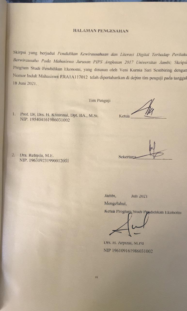 SEMBIRING, VENI KURNIA SARI (2021) PENGARUH PENDIDIKAN KEWIRAUSAHAAN DAN LITERASI DIGITAL TERHADAP PERILAKU BERWIRAUSAHA PADA MAHASISWA JURUSAN PIPS ANGKATAN 2017 UNIVERSITAS JAMBI. S1 thesis, Universitas Jambi.