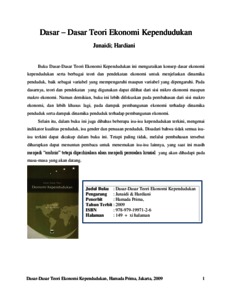 Buku Dasar-Dasar Teori Ekonomi Kependudukan ini menguraikan konsep dasar ekonomi kependudukan sertaberbagai teori dan pendekatan ekonomi untuk menjelaskan dinamika penduduk, baik sebagai variabel yang mempengaruhi maupun variabel yang dipengaruhi. Pada dasarnya, teori dan pendekatan yang digunakan dapat dilihat dari sisi mikro ekonomi maupun makro ekonomi. Namun demikian, buku ini lebih difokuskan pada pembahasan dari sisi makro ekonomi, dan lebih khusus lagi, pada dampak pembangunan ekonomi terhadap dinamika penduduk serta dampak dinamika penduduk terhadap pembangunan ekonomi. Selain itu, dalam buku ini juga dibahas beberapa isu-isu kependudukan terkini, mengenai indikator kualitas penduduk, isu gender dan penuaan penduduk. Disadari bahwa tidak semua isu-isu terkini dapat dicakup dalam buku ini. Tetapi paling tidak, melalui pembahasan tersebut diharapkan dapat menuntun pembaca untuk menemukan isu-isu lainnya, yang saat ini masih menjadi “embrio” tetapi diperkirakan akan menjadi persoalan krusial yang akan dihadapi pada masa-masa yang akan datang.