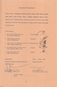ABSTRAK Trawarsa, Deci. 2018. Hubungan motivasi belajar dengan hasil belajar sejarah siswa kelas X IPS Di SMA Negeri 1 Jujuhan Kabupaten Bungo. Pembimbing (I) Dr. Dra. Farida Kohar, M. P (II) Nelly Indrayani, M. Hum Kata Kunci. Motivasi belajar, hasil belajar siswa mata pelajaran sejarah Rendahnya motivasi siswa dipengaruhin oleh faktor internal dan eksternal yang merupakan salah satu masalah yang dihadapi dalam pendidikan. Di SMA Negeri 1 Jujuhan Kabupaten Bungo ditemukan motivasi siswa dalam belajar di sekolah tidak sesuai dengan yang diharapkan. Adapun hal yang menyebabkan siswa tidak termotivasi karena beberapa hal seperti keadaan fisiknya menurun, psikologisnya terganggu, lingkungan yang kurang mendukung, kurangnya perhatian dari keluarga, dan berada di lingkungan masyarakat yang sangat kurang akan tentang pendidikan serta salah memilih teman sehingga dapat membuat siswa kurang termotivasi dalam belajar karena hal-hal yang sangat tidak mendukungnya dan tindak membangkitkan motivasi dalam belajarnya. Jadi motivasi yang ada dari dalam dirinya tidak dapat tercapai dengan baik. Terlihat motivasi siswa yang menurun berhubungan terhadap nilai hasil belajarnya yang rendah. Berdasarkan tujuan dari penelitian ini adalah untuk mengetahui Hubungan Motivasi Belajar Dengan Hasil Belajar Sejarah Siswa Di SMA Negeri 1 Jujuhan Kabupaten Bungo. Jenis penelitian adalah penelitian korelasional. Adapun dalam penelitian ini digunakan analisi korelasi untuk melihat ada tidaknya hubungan antara variabel bebas dengan variabel terikat yang ditunjukkan oleh koefisien korelasi, subjek penelitian ini adalah siswa kelas X IPS SMA Negeri 1 Jujuhan yang berjumlah 55 orang. Sedangkan intrument penelitian ini berupa angket, data yang diperoleh dengan menyebar angket kepada siswa kelas X IPS. Data dianalisi dengan menggunakan SPSS 23.0. Hasil penelitian menunjukkan bahwa adanya hubungan pada kategori kuat, koefesien korelasinya sebesar 0,660 > r tabel 0,226 perhitungan menggunakan analisis korelasi product moment, dan harga signifikansinya 0,000 < 0,05. Berdasarkan hasil penelitian yang telah dilakukan harapan kedepan adalah penelitian ini berguna sebagai bahan informasi dan masukan bagi siswa kelas X IPS SMA Negeri 1 Jujuhan Kabupaten Bungo, agar bisa lebih meningkatkan hasil belajar, dan diharapkan bisa menjadi lebih berguna dan bermanfaat untuk penelitian selanjutnya.