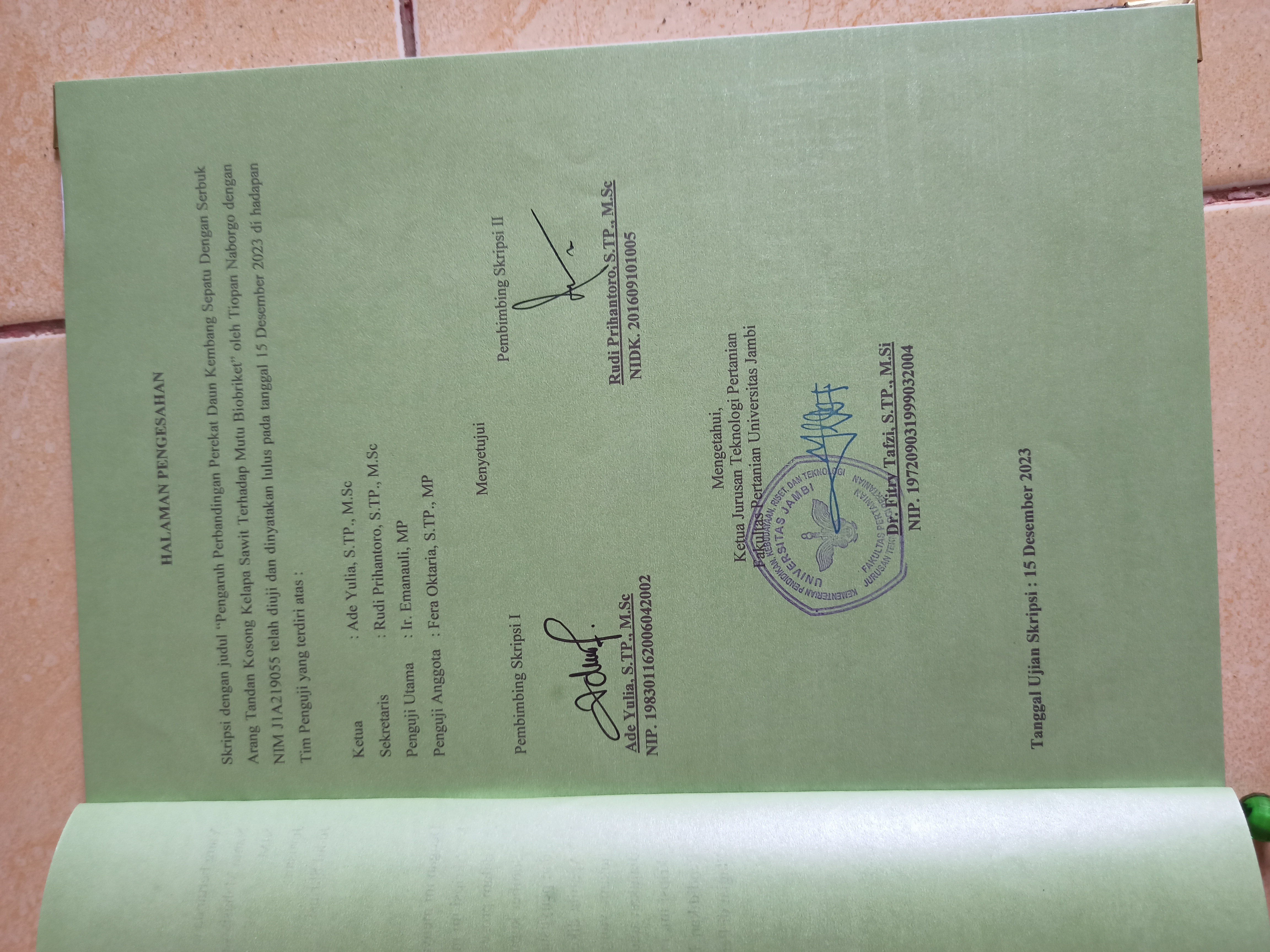 Naborgo, Tiopan and Yulia, Ade and Prihantoro, Rudi (2024) Pengaruh Perbandingan Perekat Daun Kembang Sepatu Dengan Serbuk Arang Tandan Kosong Kelapa Sawit Terhadap Mutu Biobriket. S1 thesis, UNIVERSITAS JAMBI.