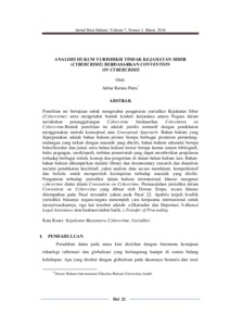 ABSTRAK Penelitian ini bertujuan untuk mengetahui pengaturan yurisdiksi Kejahatan Siber (Cybercrime) serta mengetahui bentuk konkrit kerjasama antara Negara dalam melakukan penanggulangan Cybercrime berdasarkan Convention on Cybercrime.Bentuk penelitian ini adalah yuridis normatif dengan pendekatan menggunakan metode konseptual atau Conceptual Approach. Bahan hukum yang dipergunakan adalah bahan hukum primer berupa berbagai peraturan perundang-undangan yang terkait dengan masalah yang diteliti, bahan hukum sekunder berupa buku/literatur dan jurnal serta bahan hukum tersier berupa kamus umum bibliografi, buku pegangan, ensiklopedi, terbitan pemerintah yang dapat memberikan penjelasan terhadap berbagai istilah, konsep dan pengertian di dalam bahan hukum lain. Bahan-bahan hukum dikumpulkan melalui library dan documentary research dan dianalisis melalui pendekatan kualititaif, yakni analisis data secara mendalam, komprehensif dan holistic untuk memperoleh kesimpulan terhadap masalah yang diteliti. Pengaturan terhadap yurisdiksi dalam hukum internasional khusus mengenai cybercrime diatur dalam Convention on Cybercrime. Permasalahan yurisdiksi dalam Convention on Cybercrime yang dibuat oleh Dewan Eropa, secara khusus ditempatkan pada Pasal tersendiri yakini pada Pasal 22. Apabila terjadi konflik yurisdiksi biasanya negara-negara menempuh cara kerjasama internasional untuk menyelesaikannya, tiga hal tersebut adalah: a.Ekstradisi dan Deportasi; b.Mutual Legal Assistance atau bantuan timbal balik; c.Transfer of Proceeding. Kata Kunci: Kejahatan Mayantara, Cybercrime, Yurisdiksi.