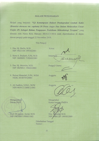 ABSTRAK Maryani, Riris. 2018. Uji Kemampuan Bakteri Pendegradasi Limbah Kubis (Brassica oleracea var. capitata) di Pasar Angso Duo Dalam Melarutkan Unsur Fosfat (P) Sebagai Bahan Pengayaan Praktikum Mikrobiologi Terapan: Skripsi, Jurusan Pendidikan Matematika dan Ilmu Pengetahuan Alam, FKIP Universitas Jambi, Pembimbing: (I) Dra. Hj. Harlis, M.Si., (II) Retni S. Budiarti, S.Pd.,M,Si., Kata kunci: Bakteri, fosfat, melarutkan, media pikovskaya Provinsi Jambi memiliki jenis tanah podsolik merah kuning (PMK) dengan luas 3.571.265 Ha. PMK dikelompokan sebagai jenis tanah yang rendah unsur hara makro diantaranya fosfat (P), di dalam tanah fosfat terdapat dalam bentuk organik dan anorganik. Kedua bentuk fosfat tersebut merupakan fosfat yang tidak larut atau sedikit larut, sehingga ketersediaanya sangat terbatas. Salah satu upaya yang dapat dilakukan dengan pengunaan bakteri pelarut fosfat (BPF). Penelitian ini bertujuan untuk mengetahui kemampuan isolat bakteri pendegradasi limbah kubis yang berada di pasar tradisonal angso duo kota jambi dalam melarutkan fosfat. Penelitian ini dilakukan di Laboraturium Biologi Fakultas Keguruan dan Ilmu Pendidikan Universitas Jambi Pada September 2018. Hasil penelitian diperoleh dengan cara mengukur diameter zona bening yang terbentuk disekitar koloni bakteri pada hari terakhir masa inkubasi selama 7 hari sehingga diketahui nilai indeks kelarutan fosfat (IKF). Hasil perhitungan IKF dianalisis secara deskriptif untuk mengetahui kemampuan genus bakteri pendegradasi limbah kubis dalam melarutkan fosfat. Hasil penelitian menunjukan bahwa terdapat 3 genus bakteri pendegradasi limbah kubis yang diujikan pada media pikovskaya membentuk zona bening di sekitar koloni bakteri dan dapat diindikasikan memiliki kemampuan dalam melarutkan fosfat. Didapatkan data hasil bahwa genus bakteri pendegradasi limbah kubis yang membentuk zona bening yaitu genus Brucella sebesar 37 mm, Halococcus 30 mm dan Neisseria 27 mm. Setelah dilakukan penelitian ini, maka disarankan kepada peneliti selanjutnya agar digunakan sebagai acuan pembuatan pupuk hayati (biofertilizer). Dalam meningkatkan ketersedian unsur hara fosfat yang sangat terbatas pada tanah yang memiliki tingkat ketersedian unusr hara khususnya fosfat dan dapat dijadikan bahan pengayaan pratikum pada mata kuliah mikrobiologi terapan.