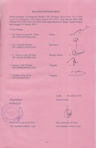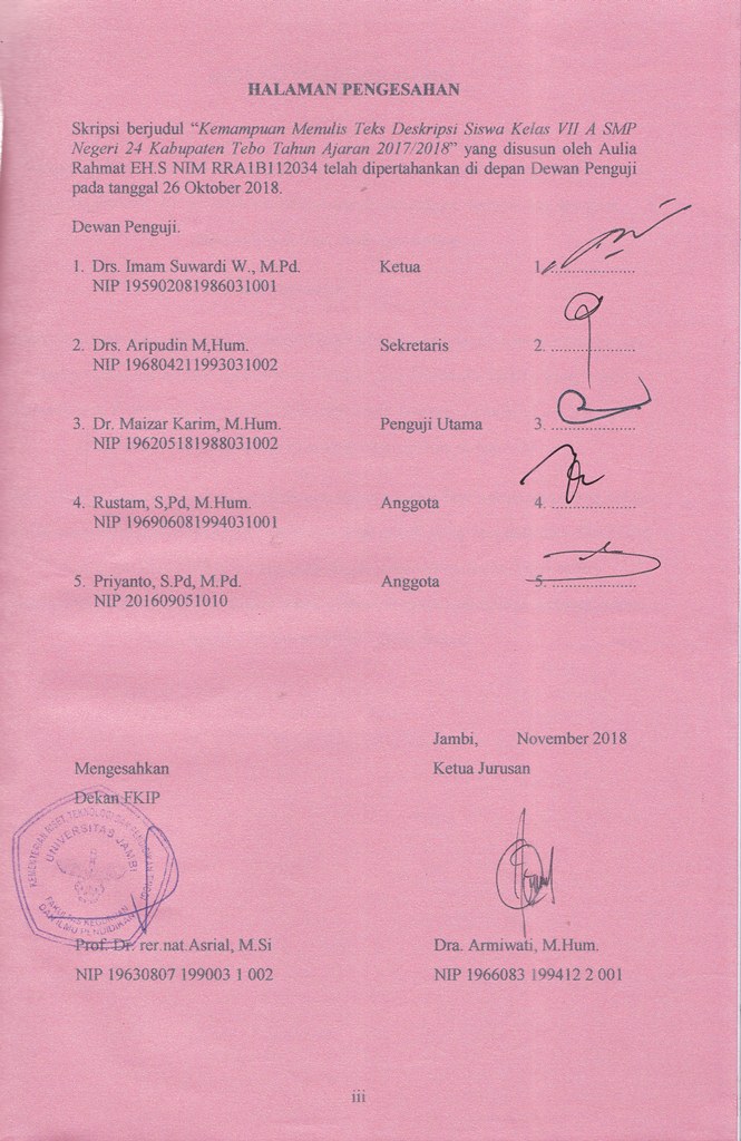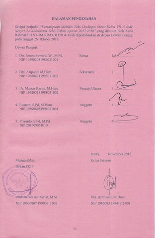 ABSTRAK EH.S Rahmat, Aulia. 2018. Kemampuan Menulis Teks Deskripsi Siswa Kelas VII A SMP Negeri 24 Kabupaten Tebo Ajaran 2017/2018. Skripsi, Program Studi Pendidikan Bahasa dan Sastra Indonesia, Jurusan Pendidikan Bahasa dan Seni, FKIP Universitas Jambi. Pembimbing: (I) Drs. Imam Suwardi Wibowo, M. Pd. (II) Drs. Aripudin, M. Hum. Kata Kunci: Kemampuan.Menulis.Teks.Deskripsi.Siswa.Aspek Ciri Teks, Aspek Tujuan Teks, Aspek Struktur Teks. Tujuan penelitian ini mendeskrepsikan kemampuan siswa dalam menulis teks deskripsi. Selain itu karena belum pernah diadakan penelitian mengenai kemampuan menulis teks deskripsi di SMP Negeri 24 Kabupaten Tebo. Metode penelitian ini menggunakan deskriptif dengan pendekatan kuantitatif. Deskriptif kuantitatif adalah jenis penelitian yang berusaha untuk menuturkan permecahan masalah yang ada sekarang berdasarkan data-data serta mendeskripsikan data yang dilakukan melalui proses perhitungan, penjumlahan, dan pemerolehan hasil berupa presentase dengan kriteria yang ditentukan. Subjek penelitian adalah seluruh siswa kelas VII A SMP Negeri 24 Kabupaten Tebo yang berjumlah 27 siswa. 12 siswa laki-laki dan 15 siswa perempuan. Hasil penelitian menunjukan bahwa kemampuan siswa kelas VII A SMP Negeri 24 Kabupaten Tebo yakni berkualitas mampu, dengan rincian (1) menulis teks deskripsi a) aspek ciri teks deskripsi 77,1 (mampu), dan b) aspek tujuan teks deskripsi 72,9 (mampu), c) struktur teks deskripsi 76,2 (mampu). Berdasarkan hasil penelitian disarankan kepada guru bahasa Indonesia SMP Negeri 24 Kabupaten Tebo agar perlu meningkatkan kualitas pengajaran menulis teks deskripsi, terutama pada aspek ciri teks deskripsi, aspek tujuan teks deskripsi dan aspek struktur teks deskripsi. Hal ini agar kedepannya kemampuan siswa dalam menulis ketiga unsur itu dapat lebih baik lagi.