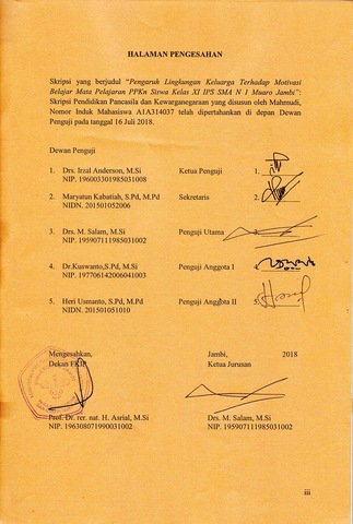 ABSTRAK Mahmudi. 2018. Pengaruh Lingkungan Keluarga Terhadap Motivasi Belajar Mata Pelajaran PPKn Siswa Kelas XI IPS SMA N 1 Muaro Jambi.Skripsi, Jurusan Pendidikan Ilmu Sosial, FKIP Universitas Jambi, Pembimbing: (I) Drs. Irzal Anderson, M.Si, (II) Maryatun Kabatiah, M.Pd Kata kunci: Lingkungan Keluarga, Motivasi Belajar Lingkungan keluarga merupakan tempat seorang anak pertama kali untuk mengenal pendidikan. Keluarga mempunyai peranan besar dalam pemberian motivasi belajar, karena dengan adanya motivasi akan memudahkan siswa untuk belajar. Namun pada kenyataanya tidak banyak siswa yang memiliki motivasi yang tinggi dalam belajarnya. Lingkungan keluarga diharapkan mampu memberi sumbangan yang positif terhadap pemberian motivasi belajar agar anak tersebut lebih bersemangat lagi. Karena didalam keluarga merupakan lingkungan pertama seorang anak untuk mengenal pendidikan dan didalam keluarga pula seorang anak akan mendapatkan arahan, bimbingan dan dorongan. Penelitian ini bertujuan untuk mengetahui pengaruh lingkungan keluarga terhadap motivasi belajar mata pelajaran PPKn siswa kelas XI IPS SMA N 1 Muaro Jambi. Penelitian ini merupakan penelitian deskriptif kuantitatif, dilaksanakan di SMA 1 Muaro Jambi pada siswa kelas XI IPS dengan sampel berjumlah 61 orang siswa. Data dalam penelitian ini dikumpulkan melalui angket, diolah dengan analisis regresi linier sederhana dengan menggunakan uji hipotesis yaitu uji t dengan bantuan Microsoft Excel 2007 dan SPSS versi 22.0. Hasil penelitian ini menunjukkan bahwa lingkungan keluarga yang baik akan meningkatkat motivasi belajar. Kesimpulan penelitian ini menunjukkan pengaruh yang signifikan antara lingkungan keluraga terhadap hasil belajar dengan besaran pengaruh dalam uji hipotesis sebesar 0.631 dengan nilai signifiksn 0,000 < α = 0,05. Dalam koefisien determinasi terdapat pengaruh sebesar 0.398 atau pengaruh sebesar 39.8%. Berdasarkan penelitian ini diharapkan keluarga mampu menciptakan lingkungan keluarga yang nyaman dan kondusif sehingga dapat meningkatkan motivasi belajar siswa.