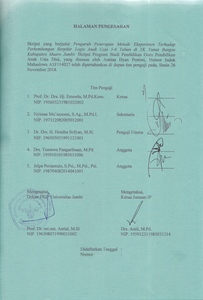 ABSTRAK Pertiwi, Annisa Dyan. 2018. Pengaruh Penerapan Metode Eksperimen terhadap Perkembangan Berpikir Logis Anak Usia 5-6 Tahun di TK Tunas Bangsa Kabupaten Muaro Jambi: Skripsi, Jurusan Ilmu Pendidikan, FKIP Universitas Jambi, Pembimbing: (I) Prof., Dr., Hj., Emosda, M.Pd.Kons., (II) Nyimas Muazomi, S.Ag., M.Pd.I. Kata Kunci: Metode Eksperimen, Perkembangan Berpikir Logis. Penelitian ini bertujuan untuk mendeskripsikan pengaruh penerapan metode eksperimen terhadap perkembangan berpikir logis anak usia 5-6 tahun kelas B TK Tunas Bangsa Kabupaten Muaro Jambi TahunPelajaran 2018/2019. Penelitian ini dilakukan di TK Tunas Bangsa Kabupaten Muaro Jambi pada19 juli 2018-19 September 2018. Jenis Penelitian yang digunakan penelitian kuantitatif dan dalam melakukan penelitiannya menggunakan metode eksperimen untuk mencari pengaruh, adapun jenis metode eksperimen dipakai adalah desain Pre-Experimental Designs dan rancangan yang digunakan One-Group Pretest-Postest Design. Sampel yang digunakan pada penelitian ini adalah sampel jenuh, dimana seluruh populasi dijadikan sampel karena populasi berjumlah dibawah 30. Metode pengumpulan data dengan cara menyebarkan angket, untuk teknik analisis data dalam penelitian ini menggunakan statistik nonparametrik. Yaitu uji Wilcoxon Match Test (Uji Jenjang Bertanda Wilcoxon). Berdasarkan hasil perhitungan statistik maka diperoleh T_hitung < T_tabel= 0 < 66 dan 〖 Z〗_hitung>Z yaitu 5,4329>1,96. sehingga H_o ditolak dan H_a diterima. Dengan demikian hipotesis penelitian yang berbunyi “Metode Eksperimen Memiliki Pengaruh Signifikan Terhadap Perkembanga Berpikir Logis Anak Usia 5-6 Tahun di TK Tunas Bangsa Kabupaten Muaro Jambi”. Kemudian diperoleh perhitunga effect size yaitu d= 1,36. Berdasarkan tabel interpretasi Cohen’s maka pengaruhnya tergolong kuat (stong effect).