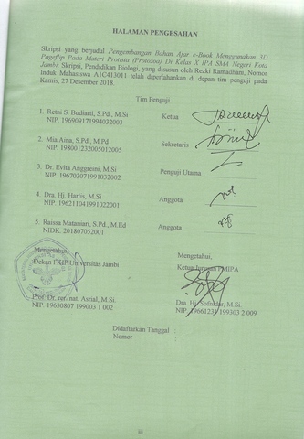 ABSTRAK Ramadhani, R. 2018. Pengembangan Bahan Ajar E-Book Menggunakan 3D Pageflip Pada Materi Protista (Protozoa) di Kelas X IPA SMA N 8 Kota Jambi : Skripsi, Jurusan PMIPA, FKIP Universitas Jambi, Pembimbing: (I) Retni S. Budiarti, S.Pd., M.Si (II) Mia Aina, S.Pd., M.Pd. Kata kunci : e-book, 3D Pageflip, Protista (Protozoa). Kemajuan dan pembangunan suatu bangsa sangat ditentukan oleh kualitas sumber daya manusianya. Dalam hal ini, peran pendidikan sangatlah penting untuk menghasilkan kualitas sumber daya manusia yang unggul dan berdaya saing. Kualitas pendidikan dapat ditingkatkan melalui kegiatan pembelajaran di sekolah. Maka dari itu, guru sangat berperan penting dalam menciptakan proses pembelajaran yang efektif. Proses pembelajaran akan berjalan dengan lancar dan efektif apabila ditunjang dengan adanya sarana-prasarana untuk mendukung proses pembelajaran. Salah satu sarana-prasarana yang dapat mendukung proses pembelajaran adalah tersedianya bahan ajar. Salah satu bahan ajar yang dapat diterapkan yaitu bahan ajar berbasis e-book yang dikembangkan dengan menggunakan software khusus yaitu 3D Pageflip. e-book dapat dioperasikan dengan menggunakan komputer atau laptop yang terinstal software 3D Pageflip. e-book ini sendiri memuat materi mengenai Protista (Protozoa), tidak hanya materi, e-book ini pun dibekali dengan gambar dan foto penjelas materi, serta video yang menambah daya tarik bagi siswa saat menggunakannya. Penelitian ini menerapkan model ADDIE (Analysis, Design, Development, Implementation, Evaluation). Produk yang telah dikembangkan telah melalui tahap validasi oleh tim ahli. Validasi materi dilakukan sebanyak tiga kali dengan validasi akhir diperoleh jumlah skor sebanyak 40 (sangat baik), begitu pula dengan validasi media dilakukan sebanyak tiga kali dengan validasi akhir diperoleh dengan jumlah skor sebanyak 46 (sangat baik). Ujicoba produk dilakukan oleh Guru mata pelajaran biologi dan siswa kelas X IPA di SMA Negeri 08 Kota Jambi yang terdiri dari kelompok kecil yang terdiri dari 9 orang siswa. Hasil tanggapan guru memperoleh skor 59 (Sangat setuju) dan ujicoba kelompok kecil diperoleh skor sebanyak 355 (sangat setuju). Secara keseluruhan disimpulkan bahwa e-book yang telah dikembangkan layak digunakan sebagai salah satu multimedia pembelajaran.