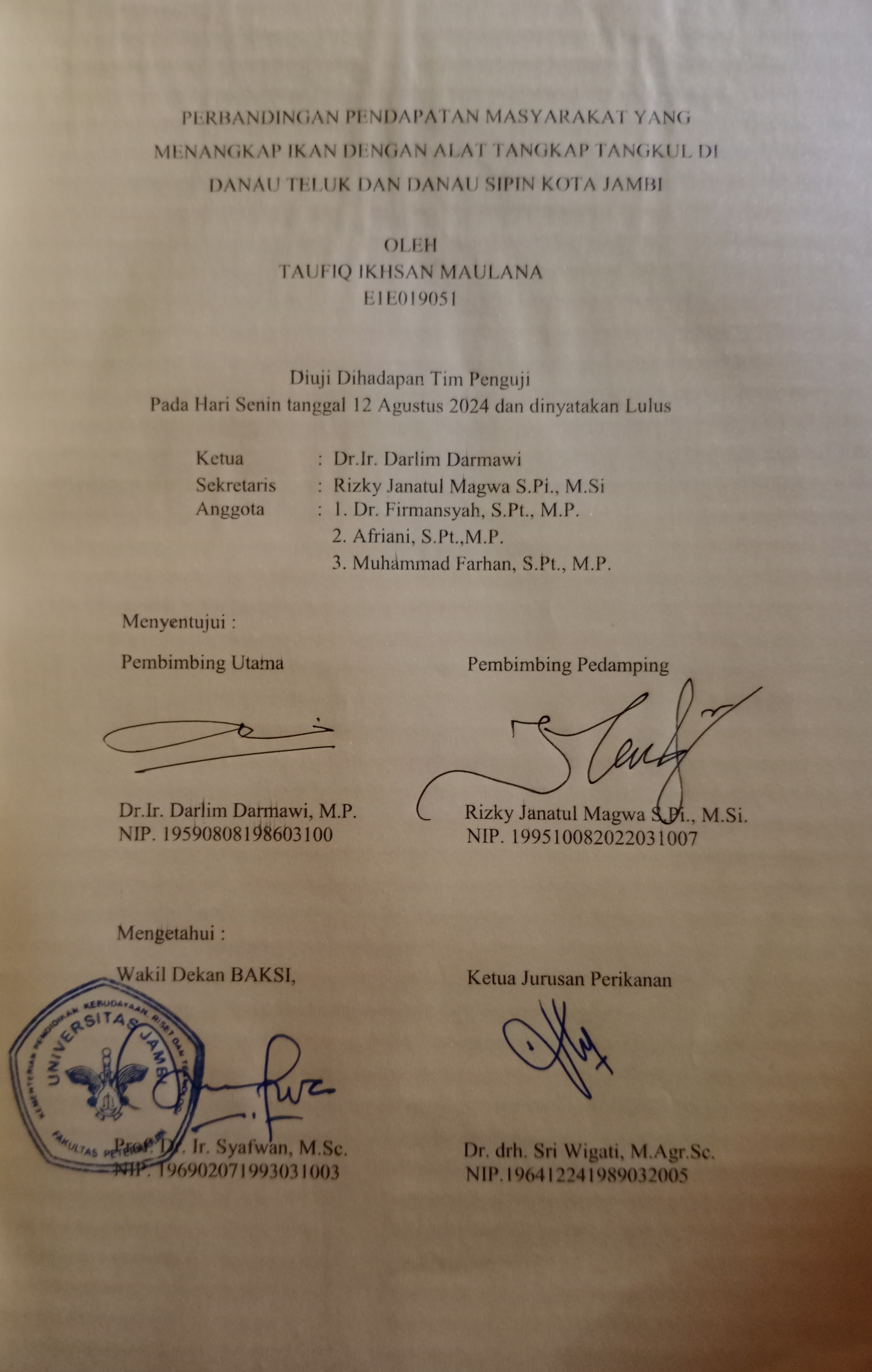 Darmawi, Darlim and Magwa, Rizky Janatul and Maulana, Taufiq ikhsan (2024) Perbandingan Pendapatan Masyarakat Yang Menangkap Ikan Dengan Alat Tangkap Tangkul Di Danau Teluk Dan Danau Sipin Kota Jambi. S1 thesis, Pemanfaatan Sumberdaya Perikanan.
