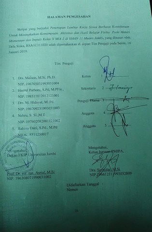 SISKA, DELA PENERAPAN LEMBAR KERJA SISWA BERBASIS KONTEKSTUAL UNTUK MENINGKATKAN AKTIVITAS DAN HASIL BELAJAR FISIKA SISWA PADA MATERI MOMENTUM DAN IMPULS DI KELAS X MIA 2 SMA NEGERI 11 MUARO JAMBI. JURNAL PENERAPAN LEMBAR KERJA SISWA BERBASIS KONTEKSTUAL UNTUK MENINGKATKAN AKTIVITAS DAN HASIL BELAJAR FISIKA SISWA PADA MATERI MOMENTUM DAN IMPULS DI KELAS X MIA 2 SMA NEGERI 11 MUARO JAMBI.