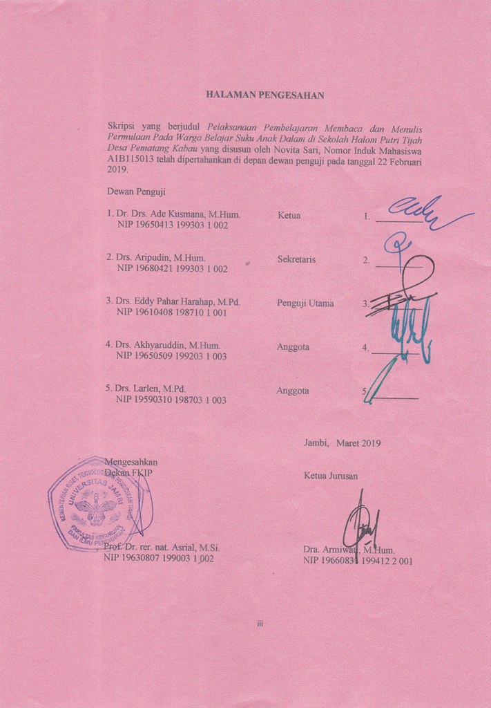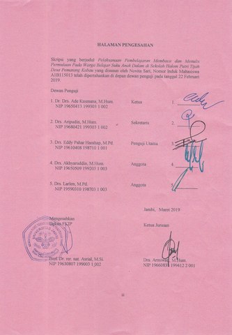 ABSTRAK Sari, Novita. 2018. Pelaksanaan Pembelajaran Membaca dan Menulis Permulaan Pada Warga Belajar Suku Anak Dalam di Sekolah Halom Putri Tijah Desa Pematang Kabau. Skripsi. Jurusan Pendidikan Bahasa dan Seni, FKIP. Universitas Jambi. Pembimbing (I) Dr. Ade Kusmana, M.Hum. (2) Drs. Aripudin, M.Hum. Kata kunci: pelaksanaan pembelajaran, membaca menulis permulaan Tujuan Penelitian ini adalah mendeskripsikan pelaksanaan pembelajaran membaca dan menulis permulaan pada warga belajar Suku Anak Dalam di Sekolah Halom Putri Tijah Desa Pematang Kabau dari segi komponen pembelajaran. Komponen pembelajaran yang dimaksud adalah Rencana Pelaksanaan Pembelajaran (RPP), pelaksanaan pembelajaran dan evaluasi pembelajaran. Dengan demikian, penelitian ini termasuk jenis penelitian deskriptif kualitatif. Hasil penelitian menunjukkan bahwa: Rencana Pelaksanaan Pembelajaran (RPP) di Sekolah Halom Putri Tijah kurang sesuai dengan komponen RPP, pelaksanaan pembelajaran membaca dan menulis permulaan sudah dilaksanakan dalam tiga tahap yaitu tahap perencanaan, pelaksanaan dan evaluasi.Tetapi, pelaksanaan pembelajarannya belum sesuai dengan RPP. Contohnya dalam RPP tidak dicantumkan metode pembelajaran dan media pembelajaran. Sementara dalam pelaksanaannya menggunakan metode pembelajaran dan media pembelajaran. Pada tahap perencanaan, guru menyusun Rencana Pelaksanaan Pembelajaran(RPP).Tahap pelaksanaan meliputi Pendahuluan, kegiatan inti,dan penutup.Tahap terakhir yaitu evaluasi. Dalam pembelajaran ini, tidak ada evaluasi awal, hanya evaluasi akhir yang dilaksanakan. Apabila dilihat dari segi hasil dari pembelajaran membaca dan menulis permulaan pada warga belajar Suku Anak Dalam di Sekolah Halom Putri Tijah tergolong cukup mampu.