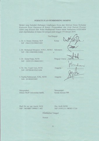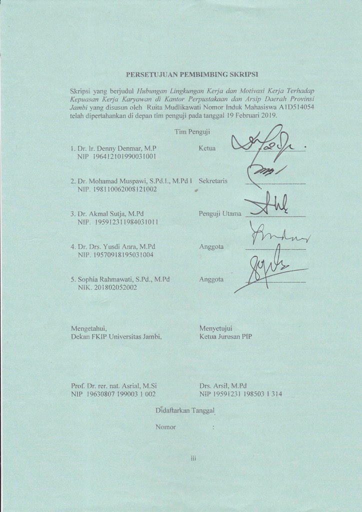 ABSTRAK Ruita Mudlikawati. 2019. “Hubungan antara lingkungan kerja dan motivasi kerja Terhadap kepuasan kerja karyawan di Kantor Perpustakaan dan Arsip Daerah Provinsi Jambi”. Kata Kunci: Lingkungan kerja, motivasi kerja, kepuasan kerja karyawan Usaha yang dilakukan Kantor Perpustakaan dan Arsip Daerah Provinsi Jambi untuk meningkatkan kineja karyawan tidak dapat berjalan mulus seperti yang direncanakan, hal ini disebabkan oleh banyak faktor diantaranya adalah: masih rendahnya anggapan rendahnya motivasi kerja. Kurangnya kesadaran, penghasilan yang kurang dan tidak dapat menutupi kebutuhan, rendahnya kepuasan kerja, rendahnya motivasi pimpinan, aturan yang sering berubah-berubah, lingkungan kerja yang kurang mendukung dan kurang kondusif seperti masih adanya sebagian gedung yang tidak layak pakai sehingga kurang menyenangkan dalam melaksanakan tugas, sarana dan prasarana serta perlengkapan kerja yang masih kurang, kerja sama antar karyawan, sulit untuk mengembangkan diri dan lain sebagainya. Faktor-faktor tersebut akan berdampak langsung terhadap kinerja seorang karyawan. Tujuan penelitian ini yaitu untuk mengetahui hubungan antara lingkungan kerja dan motivasi kerja dengan kepuasan kerja karyawan di Kantor Perpustakaan dan Arsip Daerah Provinsi Jambi. Maka penelitian ini tergolong pada jenis penelitian Ex-Post Facto, Jenis penelitian yang digunakan ini kuantitatif yaitu data yang dikumpulkan dan dinyatakan dalam bentuk angka-angka. Dalam penelitian ini alat yang digunakan peneliti dalam mengumpulkan data variabel X1, X2 dan Y yaitu dengan menggunakan kuesioner atau angket. Berdasarkan koefisien untuk variabel X1 terhadap Y, rumus (n-2) 40–2 = 38 pada α = 0,05, maka dengan dk 38, untuk uji dua pihak t 0,95 = 1,6860 mudah dilihat bahwa t_(hitung=) 2.978562 > t_tabel 1,6860 maka terdapat hubungan antara lingkungan kerja dan kepuasan kerja, Unyuk variabel X2 terhadap Y, dengan menggunakan rumus (n-2) 40–2 = 38 pada α = 0,05, maka dengan dk 38, untuk uji dua pihak t 0,95 = 1,6860 mudah dilihat bahwa t_(hitung=) 2.497891 > t_tabel 1,6860 maka terdapat hubungan antara motivasi kerja dan kepuasan kerjam untuk variabel X1 dan X2 terhadap Y perhitungan hasil analisis data antara lingkungan kerja dan motivasi kerja terhadap kepuasan kerja karyawan , diketahui r Hitung = 0.4514182. Kemudian data tersebut diuji signifikansi korelasi dengan dibandingkan rtabel pada taraf signifikansi 5% = 0,312 yang berarti Rhitung > Rtabel. Dengan demikian dapat disimpulkan terdapat hubungan lingkungan kerja dan motivasi kerja terhadap kepuasan kerja karyawan di kantor perpustakaan dan Arsip Daerah Provinsi Jambi. Sehingga dapat disimpulkan terdapat hubungan antara lingkungan kerja dan motivasi kerja dengan kepuasan kerja karyawan di Kantor Perpustakaan dan Arsip Daerah Provinsi Jambi.