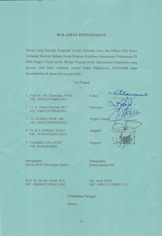 ABSTRAK Maulani, Mely. 2019. Pengaruh Variasi Stimulus Guru dan Efikasi Diri Siswa Terhadap Motivasi Belajar Siswa Program Keahlian Administrasi Perkantoran Di SMK Negeri 2 Kota Jambi : Skripsi, Jurusan Ilmu Pendidikan, FKIP Universitas Jambi, pembimbing : (I) Prof. Dr. Ekawarna, M.Psi. (II) Dr. Ir. Denny Denmar, M.P. Kata kunci : Pengaruh Variasi Stimulus Guru dan Efikasi Diri Siswa Terhadap Motivasi Belajar Siswa Program Keahlian Administrasi Perkantoran Di SMK Negeri 2 Kota Jambi. Penelitian ini bertujuan untuk mengetahui pengaruh variasi stimulus guru dan efikasi diri siswa terhadap motivasi belajar siswa program keahlian administrasi perkantoran Di SMK Negeri 2 Kota Jambi. Penelitian ini termasuk dalam penelitian deskriptif kuantitatif dimana subjek dalam penelitian ini yaitu siswa kelas XI Program Keahlian Administrasi Perkantoran SMK Negeri 2 Kota Jambi tahun ajaran 2018/2019 yang berjumlah 108 siswa dengan semua populasi dijadikan sampel dengan teknik nonprobability sampling yaitu sampel jenuh. Hasil penelitian ini menunjukkan bahwa : Diketahui bahwa koefisien variasi stimulus guru dan efikasi diri siswa terhadap motivasi belajar siswa sebanyak 71. sedangkan nilai signifikannya 0,000 ini menunjukan signifikasi karena 0,000˂0,05 sehingga dapat disimpulakan bahwa Ha diterima dan artinya bahwa terdapat pengaruh variasi stimulus dan efikasi diri siswa terhadap motivasi belajar siswa program keahlian adminitrasi perkantoran di SMK Negeri 2 Kota Jambi.