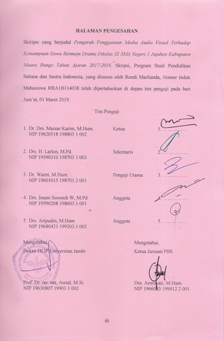 ABSTRAK Marlianda, Rendi. 2019. Pengaruh Penggunaan Media Audio Visual terhadapKemampuan Siswa Bermain Drama pada kelas XI SMA Negeri 1 Jujuhan Tahun Ajaran 2017/2018, Universitas Jambi. Pembimbing: (I) Dr. Drs Maizar Karim, M.Hum. (II) Drs Larlen, M.Pd. Kata Kunci: kemampuan bermain drama, media audio visual, pengaruh Penelitian ini adalah bertujuan untuk melihat pengaruh penggunaan media audio visual terhadap kemampuan bermain drama di kelas XI SMA Negeri 1 Jujuhan Kabupaten Bungo Tahun Pelajaran 2017-2018. Metode penelitian ini menggunakan metode Quasi Eksperimen. Penelitian ini merupakan jenis penelitian kuantitatif. Adapun data yang diambil dalam penelitian ini adalah nilai pretes dan postes kemampuan siswa bermain drama, baik itu kelompok eksperimen kelas XI IPS I maupun kelompok kontrol kelas XI IPS II. Dari hasil pretes siswa pada kelas XI IPS I mendapatkan nilai rata-rata 58,33, sedangkan dari hasil pretes siswa kelas XI IPS II mendapatkan nilai rata-rata 55,29. Setelah melakukan pretes siswa akan diberi perlakuan yaitu, XI IPS I menggunakan media audio visual, dan pada kelas XI IPS II tidak menggunakan media audio visual. Setelah diberikan perlakuan dengan menggunakan media audio visual hasil postes pada siswa kelas XI IPS I memperoleh nilai rata-rata 84,33. Adapun yang mendapatkan nilai 77,5 berjumlah dua orang, siswa dengan nilai 80 berjumlah dua orang, siswa dengan nilai 82,5 berjumlah sembilan orang, siswa dengan nilai 85 berjumlah tiga belas orang, siswa dengan nilai 87,5 berjumlah tiga orang. Sedangkan dari hasil postes pada siswa kelas XI IPS II memperoleh nilai rata-rata 71,78. Adapun yang mendapatkan nilai 60 satu orang, siswa dengan nilai 62,5 berjumlah empat orang, siswa dengan nilai 65 berjumlah dua orang, siswa dengan nilai 67,5 berjumlah tiga orang, siswa dengan nilai 70 berjumlah dua orang, siswa dengan nilai 72,5 sembilan orang, dan siswa dengan nilai 75 sembilan orang. Selanjutnya data diolah untuk melihat normalitasnya dari kedua sampel tersebut. diketahui bahwa nilai signifikansi (Sig.) pada skor postes eksperimen 0,35 > 0,05 sedangkan pada skor postes kontrol adalah 0,22 > 0,05 maka dapat disimpulkan bahwa data dari kelas ekperimen dan kelas kontrol berdistribusi normal. Selanjutnya pada uji homogenitas diperoleh nilai signifikansi 0,023 > 0,05, dapat disimpulkan bahwa data penelitian yang diperoleh peneliti normal dan homogen, sehingga bisa dilakukan uji hipotesis menggunakan uji t. Selanjutnya hasil uji hipotesis diketahui bahwa nilai t hitung lebih besar dari t table yaitu 3,305>1.672 pada df 57, maka Ha dalam penelitian ini dinyatakan diterima. Artinya, terdapat pengaruh yang signifikan antara kemampuan bermain drama siswa sebelum menggunakan media dengan sesudah menggunakan media audio visual pada siswa kelas XI IPS I SMA Negeri 1 Jujuhan.