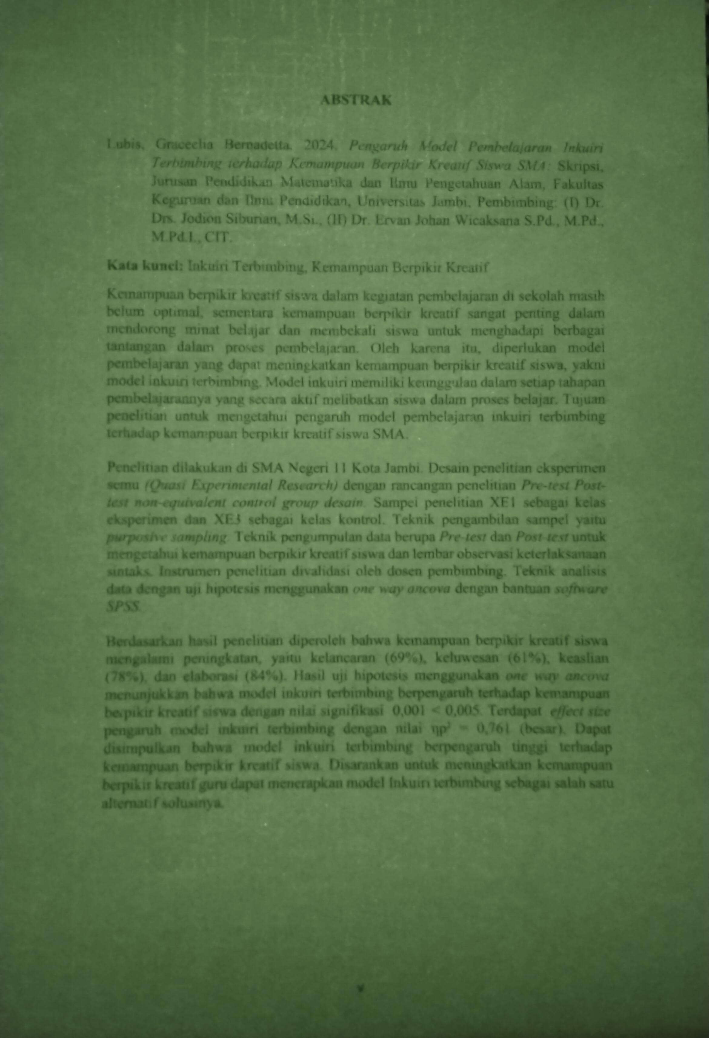 Lubis, Graceelia Bernadetta Lubis (2024) PENGARUH MODEL PEMBELAJARAN INKUIRI TERBIMBING TERHADAP KEMAMPUAN BERPIKIR KREATIF SISWA SMA. S1 thesis, Universitas Jambi.