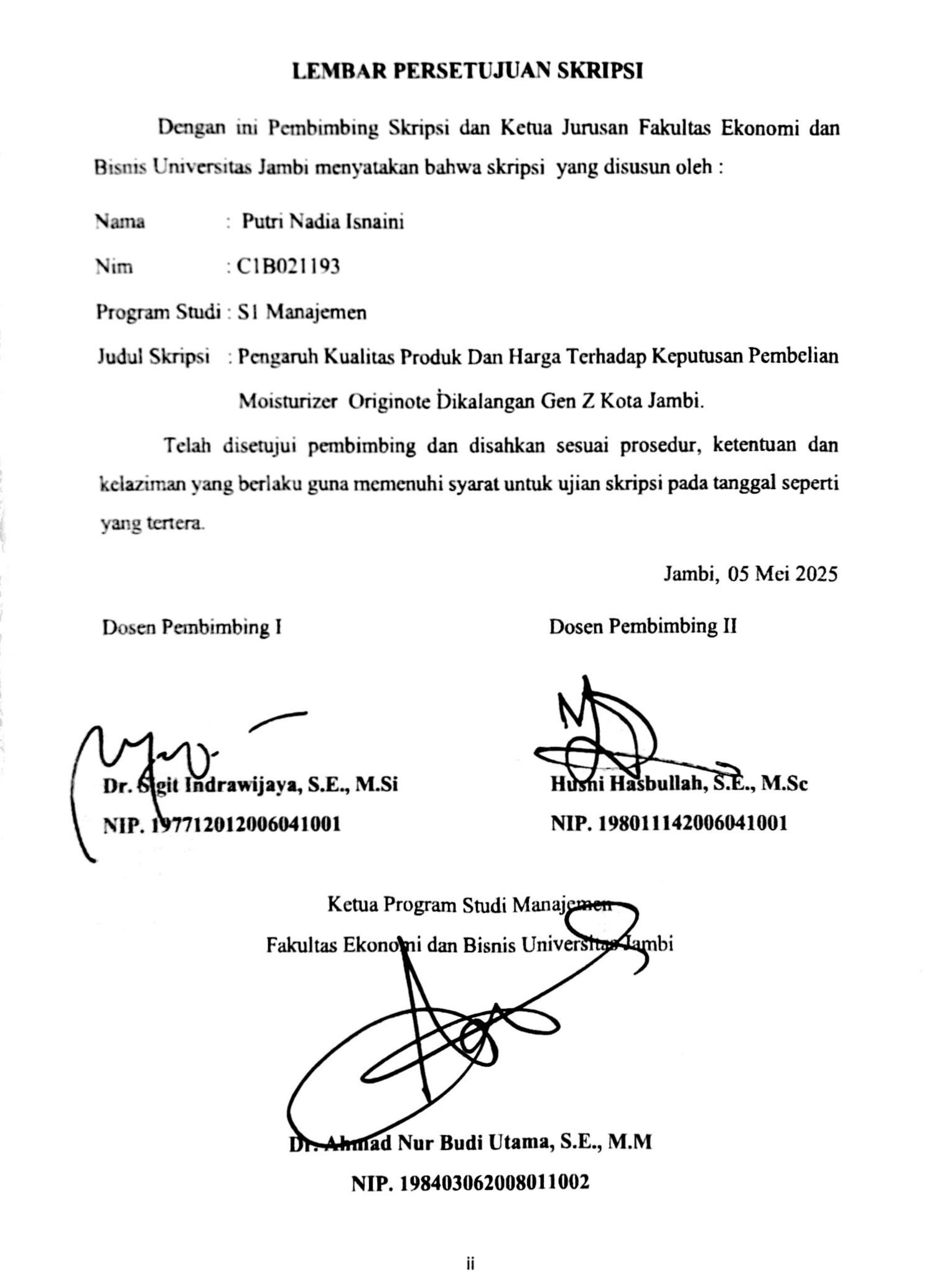 Isnaini, Putri (2025) PENGARUH KUALITAS PRODUK DAN HARGA TERHADAP KEPUTUSAN PEMBELIAN MOISTURIZER ORIGINOTE DI KALANGAN GEN Z KOTA JAMBI. S1 thesis, Management.