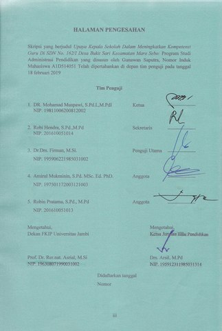 ABSTRAK Saputra, Gunawan. 2019. Upaya Kepala Sekolah Dalam Meningkatkan Kompetensi Guru Di SDN No. 162/I Desan Bukit sari Kecamatan Maro Sebo. Pembimbing (I) Dr. Mohamad Muspawi, S.Pd.I., M.Pd.I Pembimbing (II) Robi Hendra, S.Pd., M.Pd Kata Kunci: Upaya Kepala Sekolah, Kompetensi Guru,. Penelitian ini bertujuan untuk mendeskripsikan upaya kepalas sekolah dalam meningkatkan kompetensi di SDN N0. 162/I desa Bukit Sari Kecamatan Maro Sebo. Aspek yang di teliti meliputi upaya kepala sekolah dalam meningkatkan kompetensi profesional guru, serta faktor pendukung dan penghambat. Penilitian ini menggunakan pendekatan kualitatif dengan jenis penelitian study kasus. Penilitian ini dilaksanakan di SDN No. 162/I Desa Bukit Sari Kecamatan Maro Sebo. Subjek penelitian ini adalah kepala sekolah. Sumber data yang dijadikan sumber informasi adalah kepala sekolah dan guru. Teknik dalam pengumpulan data dalam penelitian ini menggunakan wawancara dan study dokumentasi. Proses analisis data di mulai dari menelaah seluruh data hasil wawancara dan study dokumentasi, dilanjutkan dengan mengadakan reduksi data, menyajikan data dan verifikasi data untuk mengambil kesimpulan. Teknik keapsahan data menggunakan triangulasi sumber. Berdasarkan hasil penelitian dan pembahasan fokus penelitian ini adalah upaya kepala sekolah dalam meningkatkan kompetensi profesional guru dengan cara melakukan pembinaan maupun mengikut sertakan guru dalam kegiatan diklat, seminar, workshop, maupun KKG, untuk memperluas pengetahuan guru serta mendapatkan ilmu yang baru, sehingga mampu menerapkannya dalam proses pembelajaran di sekolah dalam rangka meningkatkan kualitas pembelajaran dan Output peserta didik. Hambatan-hambatan yang dihadapi dalam upaya meningkatkan kompetensi profesional guru yaitu, guru maupun sekolah kesulitan untuk mengakses informasi dikarenakan koneksi ataupun jaringan di SDN No.162/i Desa Bukti Sari Kec. Maro Sebo sangat lambat, hambatan lain yang dihadapi masih ada beberapa guru yang belum memahami konsep-konsep keterkaitan antar mata pelajaran. Dari hasil penelitian direkomendasikan agar upaya kepala sekolah dalam meningkatkan kompetensi profesional guru bisa berjalan maksimal. Pertama Kepala sekolah sebagai pemimpin harus lebih aktif dalam mengembangkan seluruh tenaga pendidik yang ada di lembaga sekolah. Kedua masalah koneksi jaringan segera diatasi dan memenuhi fasilitas penunjang lainnya. Ketiga Guru harus mampu memakai berbagai metode pembelajaran di dalam kelas sehingga peserta didik akan senang dalam mengikuti proses pembelajaran.