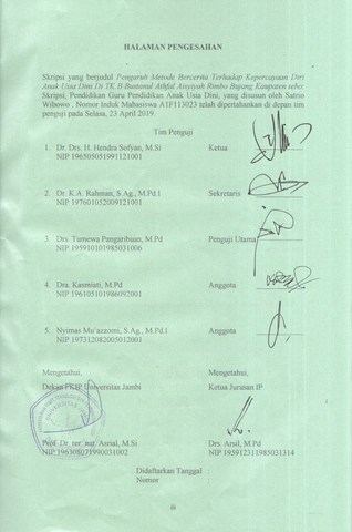 ABSTRAK Satrio Wibowo. 2019 Pengaruh Metode Bercerita Terhadap Kepercayaan Diri Anak Usia Dini di Tk-B Bustanul Athfal Aisyiyah Kecamatan Rimbo Bujang Kabupaten Tebo. Jurusan Ilmu Pendidikan. FKIP Universitas Jambi. Pembimbing I Dr. Drs. H. Hendra Sofyan, M.Si dan Pembimbing II Dr. K.A. Rahman, S.Ag., M.Pd.I Kata Kunci : Metode Bercerita, Kepercayaan Diri kepercayaan diri adalah kepercayaan akan kemampuan sendiri yang memadai dan menyadari kemampuan yang dimiliki serta dapat dimanfaatkan secara tepat. Salah satu metode yang dapat digunakan untuk mengembangkan kepercayaan diri anak usia dini adalah metode bercerita. Rumusan masalah dari penelitian ini adalah apakah dengan metode bercerita berpengaruh terhadap rasa kepercayaan diri pada anak usia dini di TK-B Bustanul Athfal Aisyiyah Kecamatan Rimbo Bujang Kabupaten Tebo? Tujuan dari penelitian ini adalah untuk mengetahui pengaruh metode bercerita terhadap kepercayaan diri anak usia dini di TK-B Bustanul Athfal Aisyiyah Kecamatan Rimbo Bujang Kabupaten Tebo. Penelitian ini menggunakan metode eksperimen. Adapun jenis metode eksperimen penelitian yang dipakai menggunakan rancangan Pretest-Postest Control group design. Penilitian ini di laksanakan di TK-B Bustanul Athfal Aisyiyah Kecamatan Rimbo Bujang Kabupaten Tebo. Populasi dalam penelitian ini sebanyak 30 siswa. Pengambilan sampel dalam penelitian ini menggunakan teknik total sampling dengan jumlah sampel sebanyak 30. Teknik analisis data dalam penelitian ini menggunakan uji-t. Hasil penelitian menunjukkan bahwa sebelum perlakuan nilai rata-rata kepercayaan diri anak di kelas B1 sebesar 54,53% dan kelas B2 sebesar 54,67% dan sama-sama berada pada kategori cukup sehingga masih perlu dikemabngkan. Setelah perlakuan kelas B1 sebagai kelas control memiliki kepercayaan diri yang tidak jauh berbeda dengan hasil pretest sebesar 57,33% dan berada pada kategori cukup. Sedangkan pada kelas eksperimen yaitu B2 menunjukkan adanya peningkatan pada kepercayaan diri anak usia dini sebesar 66,80% dan berada pada kategori baik. Hasil uji-t diperoleh nilai signifikan sebesar 0,000 (p<0,05) yang artinya terdapat perbedaan mengenai kepercayaan diri anak usia dini setelah diberi metode bercerita antara kelas perlakuan dengan kelas control, sehingga hipotesis diterima yang artinya terdapat pengaruh metode bercerita (X) terhadap kepercayaan diri anak usia dini (Y) di TK-B Bustanul Athfal Aisyiyah Kecamatan Rimbo Bujang Kabupaten Tebo. Kesimpulan dari penelitian ini adalah metode bercerita berpengaruh secara signifikan terhadap kepercayaan diri anak usia dini di TK tersebut. Hal ini terbukti dari hasil uji-t yang memperoleh nilai signifikansi sebesar 0,000 (P<0,05) yang artinya terdapat perbedaan nilai rata-rata kepercayaan diri anak pada kelas control dan kelas perlakuan.