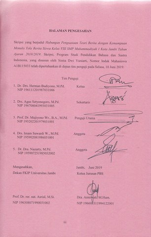 ABSTRAK Yuniarti, S. D. 2019. Hubungan Penguasaan Teori Berita dengan Kemampuan Menulis Teks Berita Siswa Kelas VIII SMP Muhammadiyah 1 Kota Jambi Tahun Ajaran 2018/2019. Skripsi, Jurusan Pendidikan Bahasa dan Seni, FKIP Universitas Jambi, Pembimbing: (I) Dr. Drs. Herman Budiyono, M.Pd., (II) Drs. Agus Setyonegoro, M.Pd. Kata kunci: hubungan, penguasaan teori, kemampuan menulis, teks berita Penelitian ini bertujuan untuk mendeskripsikan hubungan penguasaan teori berita dengan kemampuan menulis teks berita siswa kelas VIII SMP Muhammadiyah 1 Kota Jambi Tahun Ajaran 2018/2019. Jenis pendekatan yang digunakan dalam penelitian ini adalah pendekatan kuantitatif. Sementara, jenis penelitian ini merupakan penelitian survey dengan analisis korelasional. Sampel yang digunakan dalam penelitian ini adalah siswa kelas VIII A dan VIII C SMP Muhammadiyah 1 Kota Jambi yang berjumlah 44 siswa. Pembakuan instrumen penguasaan teori berita menggunakan uji validitas Korelasi Point Biserial dan uji reliabilitas menggunakan rumus KR.20. Selanjutnya, pembakuan instrumen tes kemampuan menulis teks berita menggunakan uji validitas isi dan uji reliabilitas antarpenilai (Inter-Rater). Teknik pengumpulan data menggunakan tes dan dokumentasi. Teknik analisis data menggunakan korelasi Product Moment dan uji signifikansi menggunakan rumus t_hitung. Berdasarkan hasil penelitian diketahui: 1) penguasaan teori berita siswa secara keseluruhan memperoleh rata-rata nilai 65,48 dengan kategori cukup baik, 2) kemampuan menulis teks berita siswa secara keseluruhan memperoleh rata-rata 71,7 dengan kategori baik, 3) ada hubungan yang signifikan antara penguasaan teori berita dengan kemampuan menulis teks berita siswa kelas VIII SMP Muhammadiyah 1 Kota Jambi Tahun Ajaran 2018/2019 sebesar 0,970 dengan kategori sangat kuat dan koefisien determinasi sebesar 94% (r_hitung > r_tabel yaitu 0,970 > 0.297. r_tabel N= 44 taraf signifikansi 5%= 0,297). Berdasarkan hasil penelitian di atas dapat disimpulkan bahwa ada hubungan yang signifikan antara penguasaan teori berita dengan kemampuan menulis teks berita siswa kelas VIII SMP Muhammadiyah 1 Kota Jambi Tahun Ajaran 2018/2019. Implikasi penelitian ini terdiri atas implikasi teoretis dan implikasi praktis. Implikasi teoretis sebagai hasil yang memperkuat teori dengan menunjukkan penguasaan teori berita yang baik maka semakin baik kemampuan menulis teks berita. Implikasi praktis sebagai masukan dan motivasi bagi guru agar dapat menciptakan pembelajaran yang lebih baik sehingga penguasaan teori berita siswa dapat menjadi lebih baik pula.