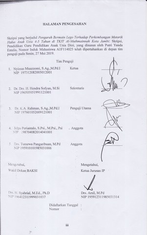 ABSTRAK Putri Yenda Estalia. 2019. “Pengaruh Bermain Lego Terhadap Perkembangan Motorik Halus Anak Usia 4-5 Tahun di TKIT AL- Muthmainnah Kota Jambi”. Skripsi. Pendidikan Guru Pendidikan Anak Usia Dini. Jurusan Ilmu Pendidikan FKIP Universitas Jambi. Pembimbing I Nyimas Muazzomi, S.Ag, M.Pd.I , Pembimbing 2 Dr. Drs. H. Hendra Sofyan, M.Si Kata Kunci: Bermain Lego, Perkembangan Motorik Halus Anak Usia 4-5 Tahun Berdasarkan pengamatan di TK Al-Muthmainnah Kota Jambi dikelas A2 masih terlihat kemampuan motorik halus anak belum optimal dimana terlihat dari 20 anak terdapat 10 anak yang masih mengalami kesulitan ketika ketika guru mencoba menstimulasi perkembangan motorik halus dengan melakukan kegiatan motorik halus anak masih terihat kaku dan susah dalam menggunakan jarinya untuk menggenggam pensil sehingga proses pembelajaran terlihat kurang optimal. terlihat ketika melakukan kegiatan motorik halus seperti menjiplak bentuk anak masih banyak dibantu oleh guru atau temanya yang sudah mahir.. Tujuan penelitian ini adalah untuk mengetahui bermain lego terhadap perkembangan motorik halus anak usia 4-5 Tahun di TKIT AL- Muthmainnah Kota Jambi. Jenis penelitian yang digunakan merupakan jenis penelitian kuantitatif dengan menggunakan rancangan Nonequivalent Control Group Design. sampel yang digunakan dalam penelitian ini yaitu sebanyak 40 siswa. Berdasarkan hasil analisis data diperolehnilai Lhitung < Ltabel untuk kedua kelas sampel. Yaitu untuk data pree test kelompok control di dapat L hitung 0.0751 yang < L tabel 01981 sedangkan untuk data post test kelompok control didapat L hitung sebesar 0,0735 yang< L tabel 0,1981. Maka dapat disimpulkan bahwa berdistribusi normal, dalam melakukan uji homogenitas variansi adalah uji F. Dengan n1 = 20, n2 = 20, S12 pree test kelompok eksperimen= 615.19 dan S22 post test kelompok eksperimen = 316.34. S12 hasil pree test kelompok control = 202.45 dan S22 post test kelompok control = 428.67 dari semua hasil data diperoleh Fhitung kelompok eksperimen = 1,68. Kelompok control diperoleh Fhitung = 0.24. Selanjutnya dengan dk pembilang (V1) = 20 dan dk penyebut (V2) = 20 diperoleh Fhitung secara keseluruhan sebesar 0.24 dengan Ftabel = 3,49. Untuk uji hipotesis dilihat bahwa thitung > ttabel yaitu 5.2620 > 1,6860 . T tabel didapat dari n1+n2 -2 = 38 yang dalam distribusi T tabel didapat nilai 1,6860 Data tersebut menunjukan pengaruh yang signifikan bermain lego terhadap perkembangan motorik halus anak usia dini 4-5 tahun di TK IT Al- Mutmainah Kota Jambi Sehingga dapat disimpulkan bahwa terdapat pengaruh bermain lego terhadap perkembangan motorik halus anak usia dini 4-5 tahun di TK IT Al- Mutmainah Kota Jambi.