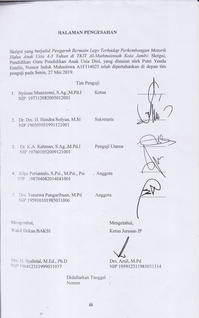 Yenda Estalia, Putri PENGARUH BERMAIN LEGO TERHADAP PERKEMBANGAN MOTORIK HALUS ANAK USIA 4-5 TAHUN DI TKIT AL - MUTHMAINNAH KOTA JAMBI. JURNAL PENGARUH BERMAIN LEGO TERHADAP PERKEMBANGAN MOTORIK HALUS ANAK USIA 4-5 TAHUN DI TKIT AL - MUTHMAINNAH KOTA JAMBI.