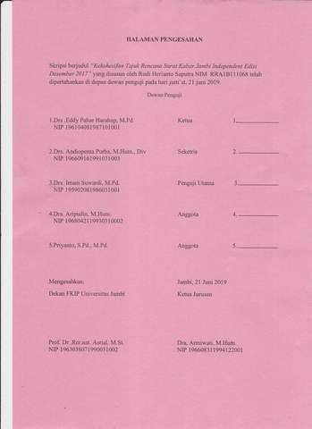 ABSTRAK Saputra, Rudi Heriaanto. 2019. Kekohesifan Tajuk Rencana Surat Kabar Jambi Independent Edisi Desember 2017.Skripsi, Jurusan Pendidikan Bahasa dan sastra, Fakultas Keguruan Ilmu Pendidikan, Universitas Jambi.pembimbing (I) Drs. Eddy Pahar Harahap, M.Pd (II) Drs. Andiopenta Purba, M.Hum. Kata Kunci : Kekohesifan, Surat Kabar , Tajuk Rencana Berdasarkan pengamatan peneliti di jambi independent tentang kekohesifan tajuk rencana surat kabar jambi independent edisi desember 2017. Penelitian ini membahas sarana kohesi tajuk rencana yaitu jenis sarana kohesi yang digunakan dalam tajuk rencana dan kekohesifan pengguna sarana kohesinya Tujuan penelitian ini adalah untuk mendeskripsikan jenis alat kohesi yang terdapat dalam tajuk rencana dan mendeskripsikan kekohesifan tajuk rencana dalam surat kabar jambi independent jambi. Dalam tajuk rencana terdapat jenis sarana kohesi yang menghubungkan kata,frasa,klausa, dan kalimat menjadi kohesif. Penelitian ini menggunakan metode deskritif-kuantitatif. Penelitian deskriptif dimaksudkan untuk mendeskripsikan gejala yang ada pada data tanpa memberikan perlakuan khusus dalam bentuk apa pun pada subjek yang diteliti. Penelitian ini menggunakan pendekatan kuantitatif karena menghasilkan data deskriptif berupa kata-kata tertulis dan mendeskripsikan data sesuai dengan kriteria yang ditentukan. Hasil penelitian menunjukkan bahwa tajuk rencana surat kabar jambi independent edisi desember 2017 menggunakan jenis sarana kohesi gramatikal dan kohesi leksikal yang terdiri atas pronomina, substitusi, elipsis, konjungtor, repitisi, antonim, sinonim, hiponim, dan kolokasi. Bersdasarkan hasil analisis, kekohesifan penggunaan sarana kohesi tajuk rencana surat kabar jambi independent edisi desember 2017 termasuk kategori sangat kohesif.