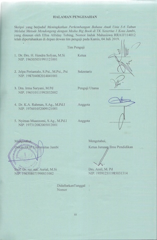 ABSTRAK Tobing, Ellsa Afriday. 2019. Meningkatkan Perkembangan Bahasa Anak Usia 5-6 Tahun Melalui Metode Mendongeng dengan Media Big Book di TK Xaverius 1 Kota Jambi. Skripsi. Program Studi Pendidikan Guru Pendidikan Anak Usia Dini, Fakultas Keguruan dan Ilmu Pendidikan Universitas Jambi, Pembimbing (I) Dr. Drs. H. Hendra Sofyan, M.Si (II) Jelpa Periantalo, S.Psi.,M.Psi.,Psi. Kata Kunci :Perkembangan Bahasa,Metode Mendongeng, Media Big Book. Penelitian ini berlatar belakang yaitu perkembangan bahasa anak Usia 5-6 Tahun melalui Metode Mendongeng Dengan Media Big Book di TK Xaverius 1 Kota Jambi masih belum optimal perkembangan bahasanya, seperti membaca, dan berbicara. Dalam metode tanya jawab anak kurang aktif. Pada umumnya anak belum mau menjawab pertanyaan ketika guru mengajukan pertanyaan karena kurangnya perbendaharaan kata, kurangnya keterampilan berkomunikasi secara lisan untuk mengungkapkan perasaan kepada orang lain. Penelitian ini bertujuan untuk mengetahui perkembangan bahasa anak usia 5-6 tahun melalui metode mendongeng dengan media big book. Jenis penelitian ini adalah tindakan kelas. Penelitian ini dilakukan di TK Xaverius 1 Kota Jambi pada bulan maret-mei 2019. Penelitian ini berfokus pada anak Kelompok B hijau TK Xaverius 1 Kota jambi yang Subjek dalam penelitian ini adalah anak usia 5-6 Tahun di kelas B Hijau TK Xaverius 1 Kota Jambi yang berjumlah 19 anak, 11 laki-laki dan 8 perempuan. Penelitian ini dimulai dari pratindakan, persiklus, dilaksanakan dalam 2 siklus masing-masing 4 kali pertemuan. Data penelitian ini tentang data hasil penelitian ini dianalisis menggunakan analisis deskriptif kuantitatif. Teknik analisis data diperoleh dengan cara mengisi angket dari pengamatan dan dokumentasi. Peneliti ini dalam pengolahan data berkolaborasi dengan guru kelas dalam mengisi lembar angket yang telah disediakan dalam setiap pertemuan. Hasil penelitian dari angket menunjukkan bahwa adanya peningkatan perkembangan bahasa anak usia 5-6 tahun melalui metode mendongeng dengan media big book di TK Xaverius 1 Kota Jambi yaitu: dari pratindakan 25%, siklus I pertemuan ke-1 29,07%, siklus I pertemuan ke-2 33,15%, dan siklus I pertemuan ke-3 43,40%, siklus I pertemuan ke-4 58,67%. Siklus II pertemuan ke-1 62,84%, siklus II pertemuan ke-2 75%, siklus II pertemuan ke-3 84,14%, akhirnya siklus II pertemuan ke-4 88,83% melebihi kriteria nilai ketuntasan 85%. Jadi dapat disimpulkan bahwa perkembangan bahasa anak usia 5-6 tahun melalui metode mendongeng dengan media big book di TK Xaverius 1 Kota Jambi mengalami peningkatan yang sangat baik melebihi kriteria keberhasilan 85%, maka penelitian tindakan kelas ini dianggap berhasil. Adapun saran dalam penelitian ini yaitu semoga dengan adanya penelitian ini dapat menjadi alternatif dalam meningkatkan perkembangan bahasa anak usia dini.