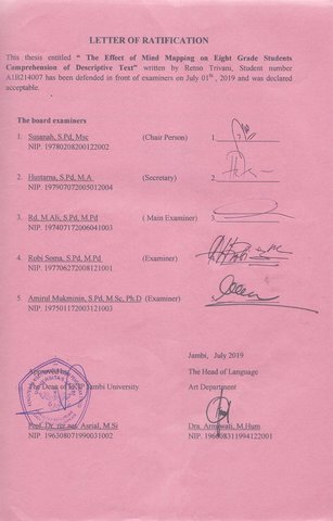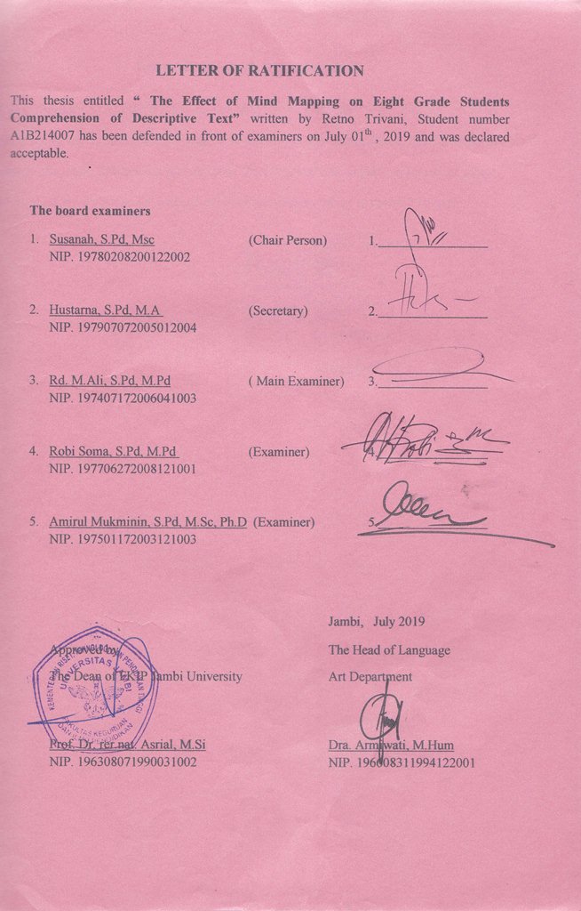 Trivani, Retno The Effect of Mind Mapping on Eight Grade Students’ Comprehension of Descriptive Text. JOURNAL The Effect of Mind Mapping on Eight Grade Students’ Comprehension of Descriptive Text.