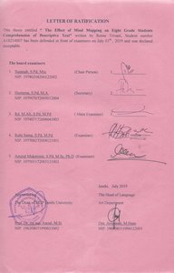 ABSTRACT Trivani, Retno. 2019. The Effect of Mind-Mapping on Eight Grade Sutdents Comprehension of Descriptive Text : An experimental Study at SMPN 16 Jambi. A thesis of English department, Faculty of Teacher Training and Education, University of Jambi. The first supervisor is Susanah, S.Pd.,M.Sc and the second supervisor is Hustarna, S.Pd, MA. Keywords: Reading Comprehension, Mind Mapping Teacher should find out a good strategy to assist students to the text that they read in teaching reading especially in Descriptive text. It will motivate and stimulate the student to comprehend the text well. it was found that the students of Eight Grade of SMP N16 Jambi have less interest in learning English. Due the reason, the teacher was interested to applied Mind Mapping. The problem of the study was “is there any significant effect of mind-mapping technique toward Eighth Grades students’ reading comprehension of descriptive text taught in SMPN 16 Jambi?” the objective of the study was to find out the effect of using mind mapping technique on students’ reading of descriptive text at the second grade students of SMPN 16 Jambi. The method used in this research was an Experimental method. In this method a quasy-experimental was used. The populations of this research were six class of Eight grade students which were devided in two classes. Pre test was administrated to six classes before selecting two classes, while the post test score was obtained from the result of the test after six meetings of the treatment. The instrument of this research was in form of multiple choice test. The result of the analysis showed the value of T-Test (3.649) is higher than the value of T-Table (2.021). It is conducted that there was a significant effect of using Mind Mpping in teaching Reading of Descriptive text on Eight grade students comprehension of SMPN 16 Jambi. This is due to cooperation done by learners which is used maximally when they use Mind Mapping inlearning process. So, the researcher suggested to the teacher especially in SMPN 16 Jambi to use Mind Mapping in teaching reading of Descriptive text.