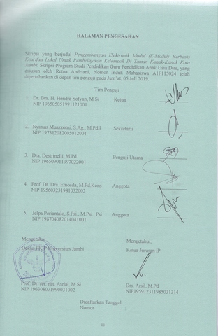 ABSTRAK Andriani, Retna., 2019. Pengembangan Elektronik Modul (E-Modul) Berbasis Kearifan Lokal Untuk Pembelajaran Kelompok Di Taman Kanak-Kanak Kota Jambi”: Skripsi, Jurusan Ilmu Pendidikan, Fkip Unversitas Jambi, Pembimbing: (1). Dr.Drs.H.Hendra Sofyan, M.Si. (2) Nyimas Muazzomi, S.Ag., M.Pd.I Kata Kunci: E-Modul, Kearifan Lokal, Model Pembelajaran Kelompok Penelitian ini dilatar belakangi dengan kurangnya pemanfaatan penggunaan ICT dalam merancang dan menyampaikan pembelajaran kelompok yang ada di TK Kota Jambi. Dimana dalam pengembangan bahan ajar masih bersifat umum belum mengarah kearifan lokal jambi atau budaya yang ada disekitar anak. Oleh karena itu peneliti ingin mengembangkan sebuah modul berupa elektronik modul yang disesuaikan dengan kearifan lokal untuk pembelajaran kelompok di Taman kanak-kanak Kota Jambi. Elektronik Modul (e-Modul) merupakan suatu alat atau sarana belajar yang berisi metode-metode, materi, batasan-batasan yang dimana dapat ditampilkan dengan menggunakan komputer dan android. Kearifan lokal adalah seperangkat rencana dan pengaturan mengenai tujuan, isi dan bahan pelajaran yang disusun oleh satuan pendidikan sesuai dengan keragaman potensi daerah, keunggulan daerah, kebutuhan daerah, dan lingkungan masing-masing serta cara yang digunakan sebagai pedoman penyelenggaran kegiatan pembelajaran kegiatan tertentu. Sedangkan Menurut Mutiah (2010:124) menyatakan bahwa model pembelajaran kelompok dengan kegiatan pengaman merupakan pola pembelajaran dimana anak-anak dibagi menjadi beberapa kelompok dengan kegiatan yang berbeda-beda. Penelitian ini merupakan penelitian R & D. Dalam penelitian ini menggunakan model ADDIE yang tedapat beberapa tahap-tahap yaitu (Analysis (analisis), Design (perencanaan), Development (pengembangan), Implementation (pelaksanaan) dan Evaluation (evaluasi). Pada penelitian ini menggunakan softwera aplikasii 3D Page Flip Profesional 1.7.7. Teknik pengumpulan data yang dilakuakn dengan menggunakan angket untuk menilai kelayakan media. Dalam pengembangan ini media divalidasi oleh ahli media dan materi sebanyak 2 tahap. Responden pada penelitian ini adalah guru, mahasiswa, dan dosen. Pada tahap Validasi diperoleh persentasi sebagai berikut. Validasi ahli media diperoleh 93,3% dengan kategori sangat baik dan layak untuk diuji cobakan dengan sedikit revisi, sedangkan validasi materi sebanyak 90% dengan kategori sangat baik layak untuk diuji cobakan dengan sedikit revisi. Hasil dari Produk yang telah direvisi kemudian diuji cobakan kepada Guru TK, Mahasiswa PG PAUD, dan dosen PG PAUD UNJA. Hasil dari pengisian angket guru TK 86%, mahasiswa 83%, dan dosen 81%. Berdasarkan data diatas dapat disimpulkan bahawa media elektronik modul (E-Modul) berbasis kearifan lokal untuk pembelajaran di Taman Kanak-Kanak Kota Jambi layak untuk digunakan sebagai panduan dalam mengembangkan bahan ajar.